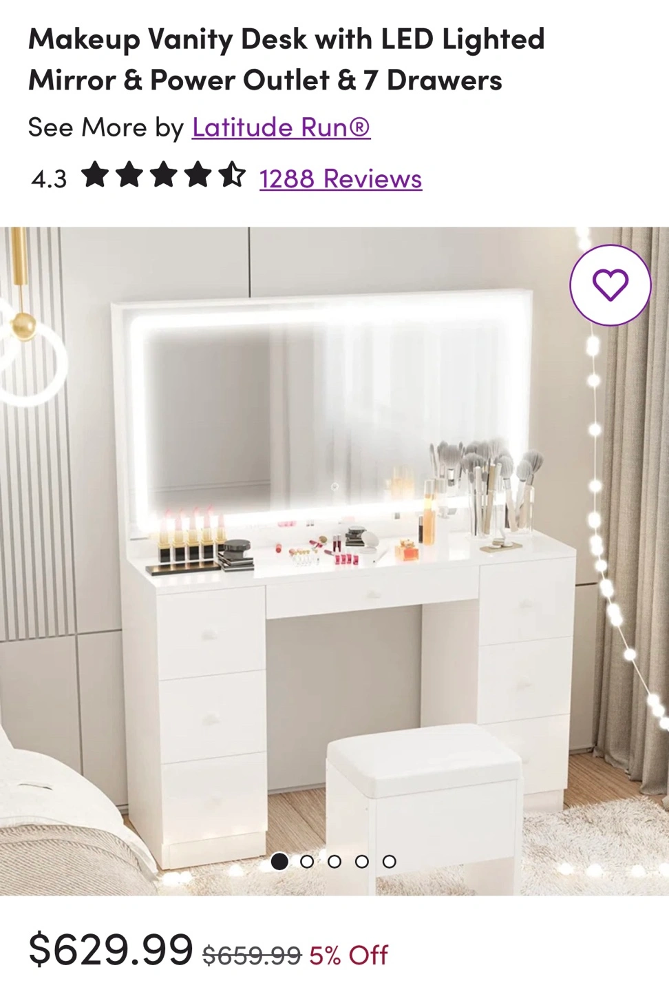 Seven-drawer vanity desk. Features an LED-lighted mirror and power outlet. Includes a cushioned stool. Modern, white design.