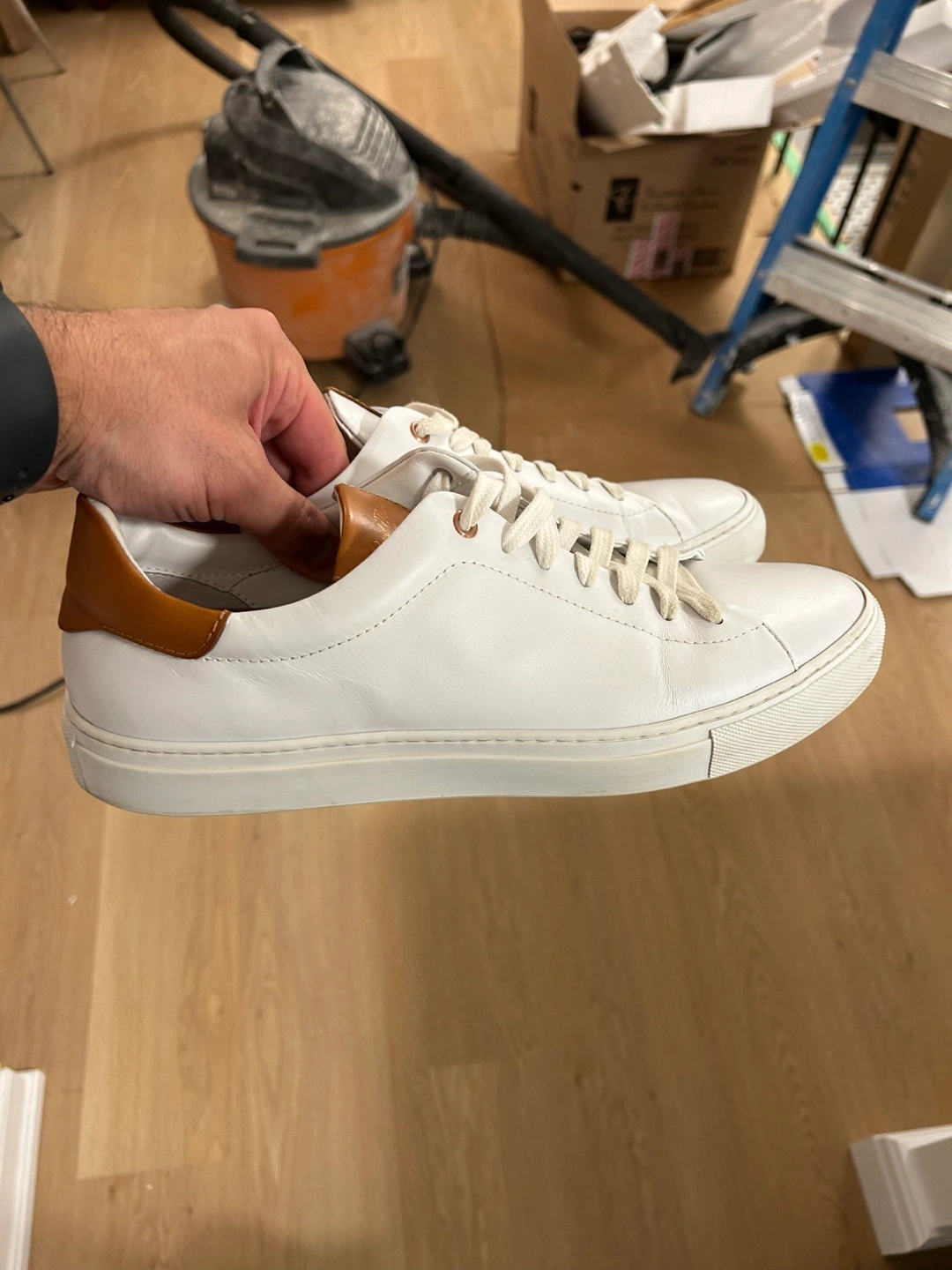 Pair of men's low-top sneakers. White leather upper, tan accents. Lace-up closure. Clean and simple design. Comfortable and stylish.