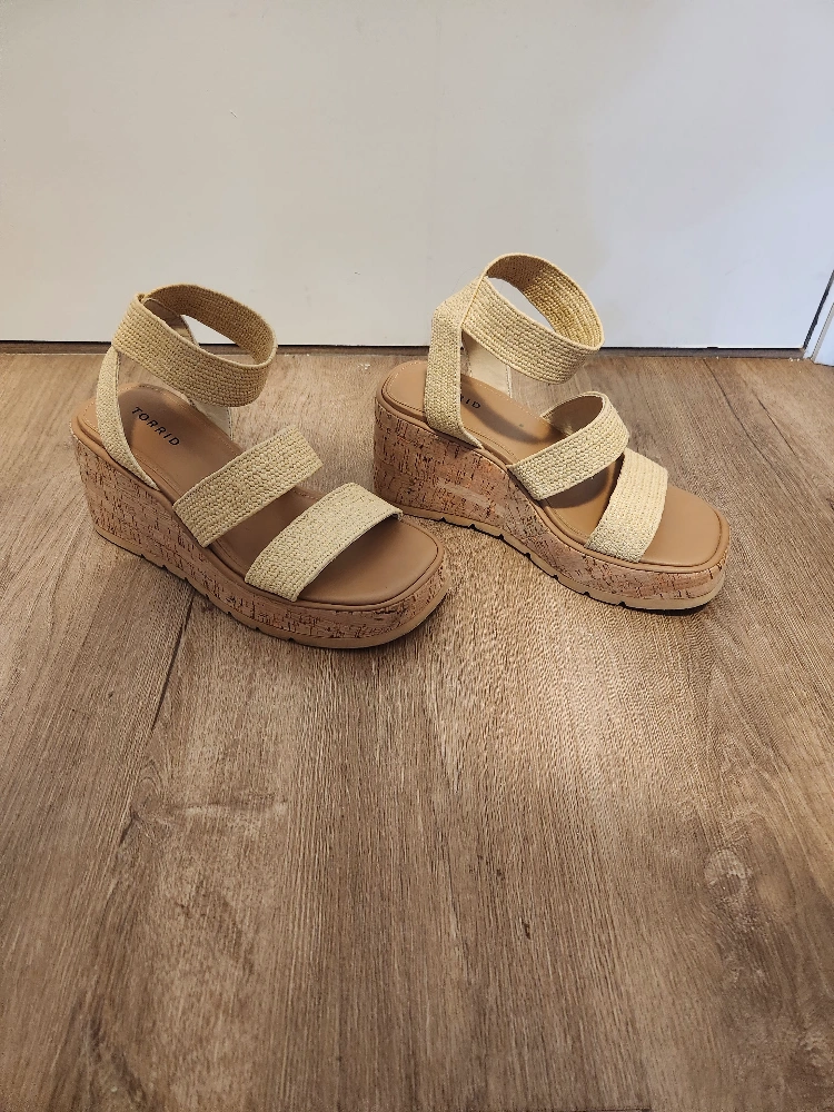 Beige woven fabric wedges. Cork platform. Elastic stretch bands. Wide Width