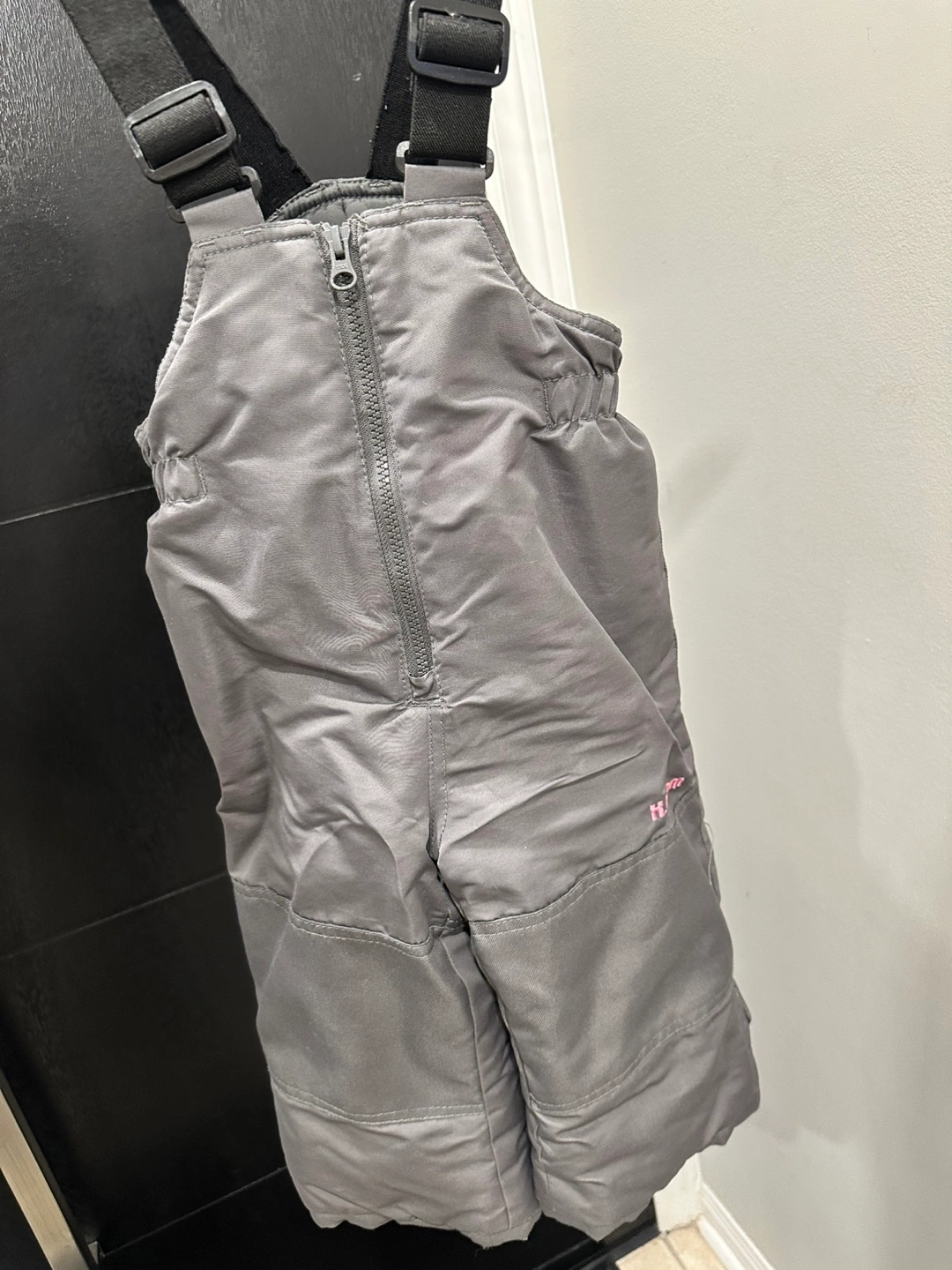 Toddler girls' grey snow pants. Full-length with suspenders. Zipper closure. Good for winter wear.