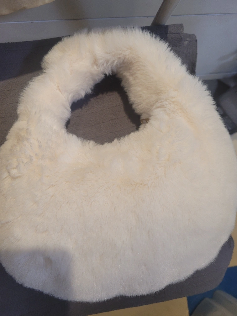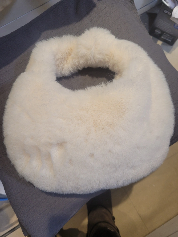91Unique cream-coloured fur bag. Soft and fluffy texture. Perfect for a stylish and cozy look. One-of-a-kind design.