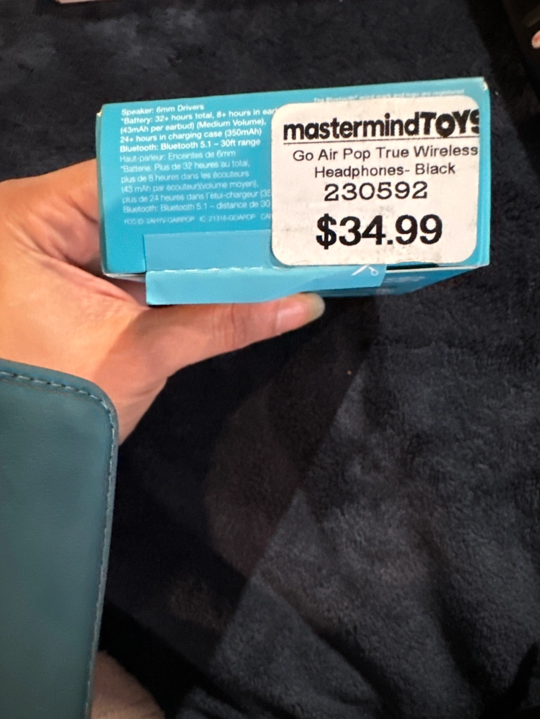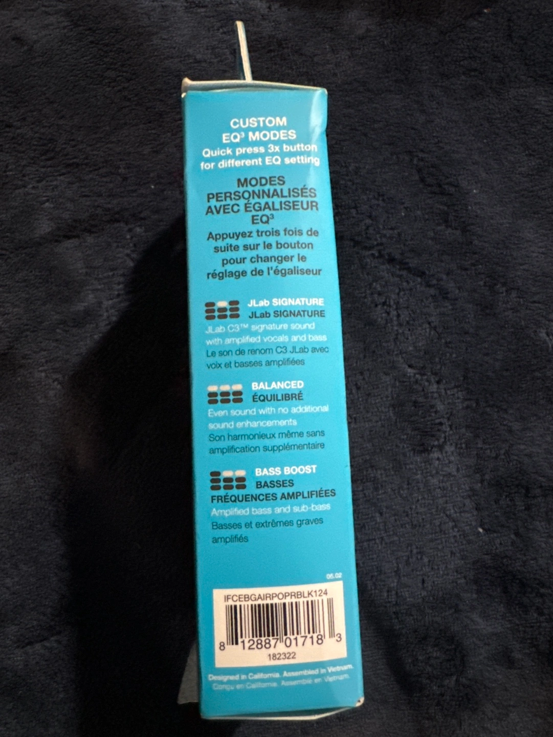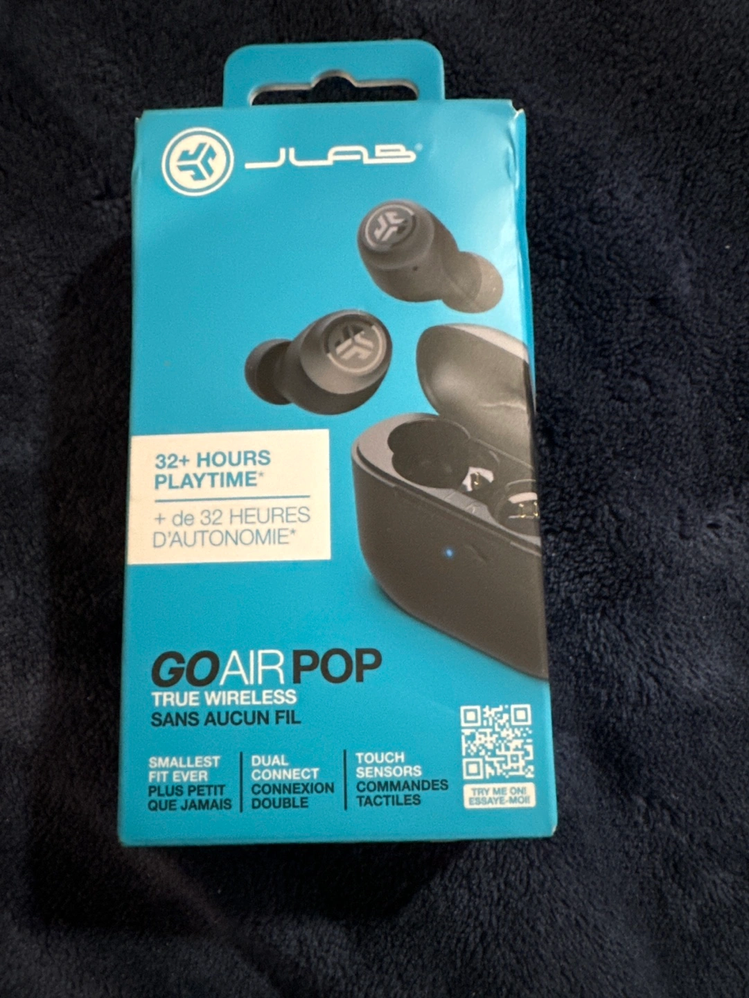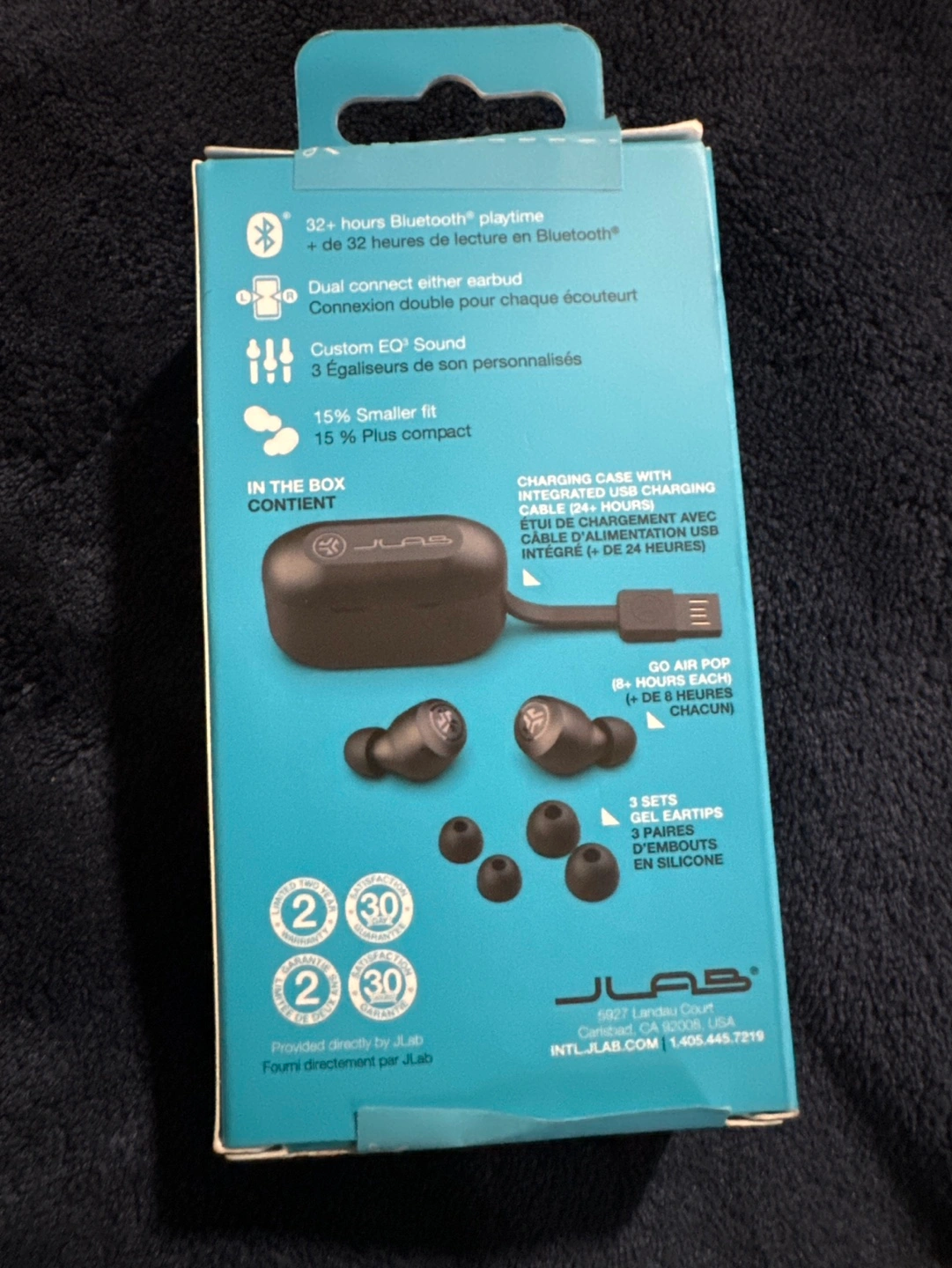 New JLab Go Air Pop true wireless earbuds. Black. 32+ hours playtime. Smallest fit ever. Dual connect. Touch controls. Charging case included. Pickup only in Burnaby at second street school