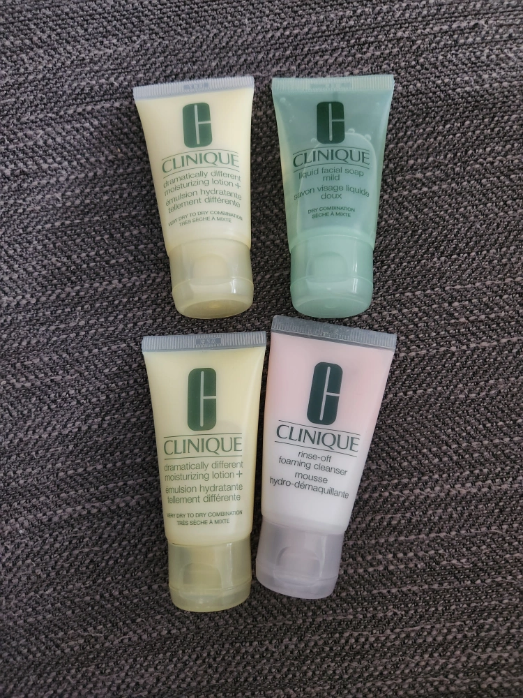 Bundle of Clinique skincare products. Includes various sizes of facial wash, lotion, and toner. Great for travel or to try out different products.