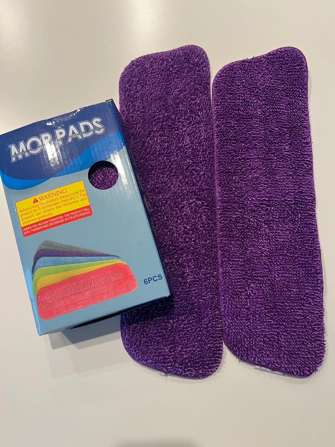 Six purple microfibre mop pads. Suitable for vinyl, hardwood, laminate, and tile floors. New, unused.
