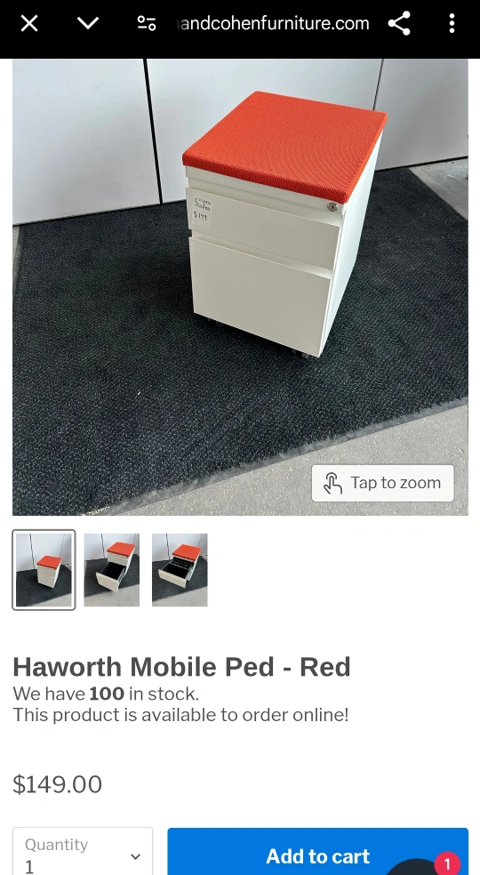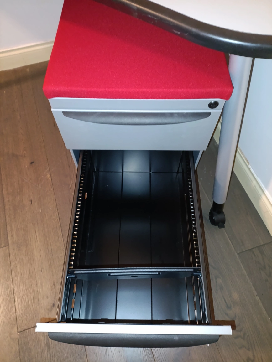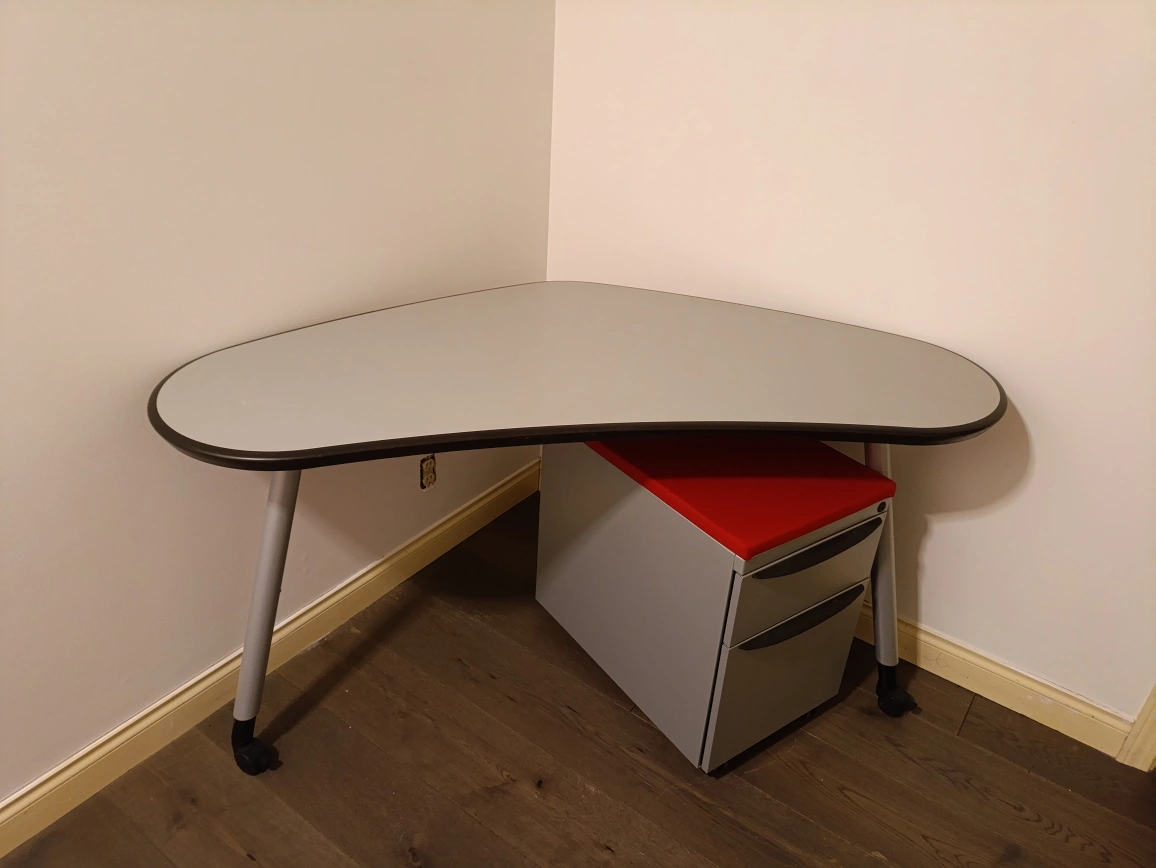 Used Haworth corner desk. Approx size 56x26x29H. Light grey laminate top. Grey legs. Includes Haworth mobile file cabinet, red top. Excellent condition. Wheels for easy mobility. Haworth Quality. $150/set