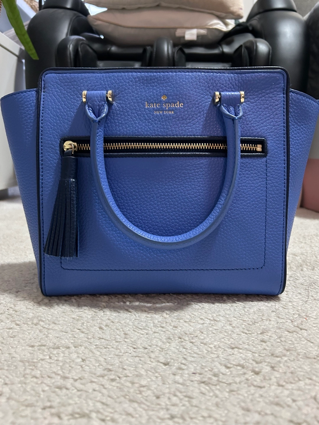Beautiful blue handbag. Features top handles, zip closure, and a detachable shoulder strap. Small, perfect for everyday use. Prize is fixed