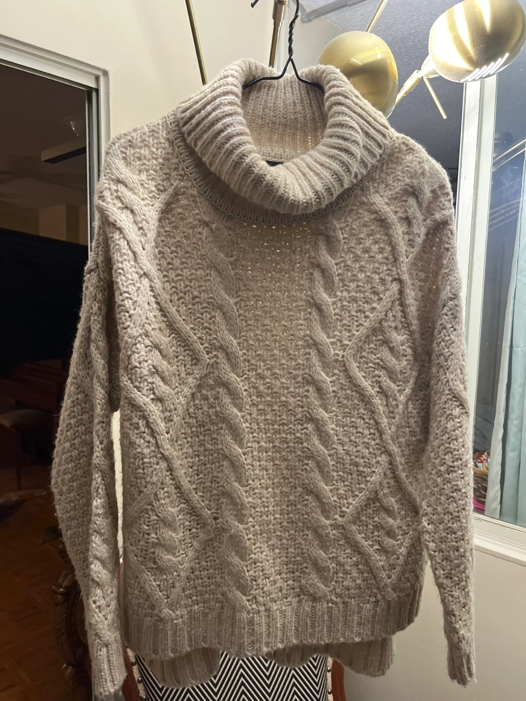 Cozy cable knit turtleneck sweater. Neutral beige colour. Long sleeves. Relaxed fit. Size medium.