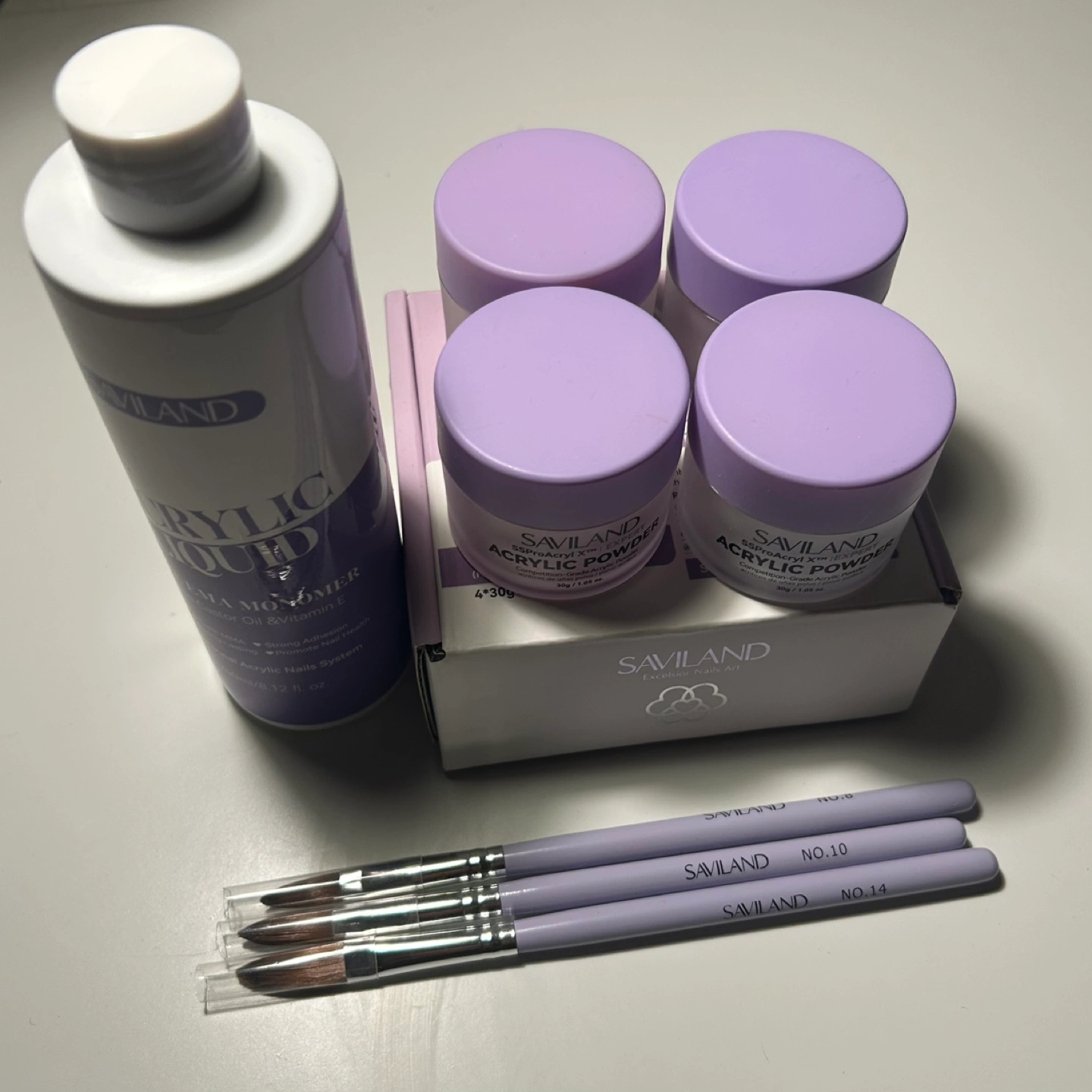 Four pots of acrylic powder and a bottle of Saviland acrylic liquid. Includes three nail art brushes. The color of acrylics contain clear, white, nude and pink. original price was about 40 bucks