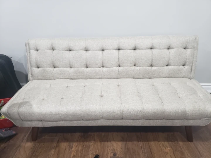 This is an excellent futon. Its a beautiful beige/cream color. Tufted design with wooden legs. Firm but comfortable cushioning. Great for small places or large. Easily fits 3 ppl to sit. Originally bought for $600.00.