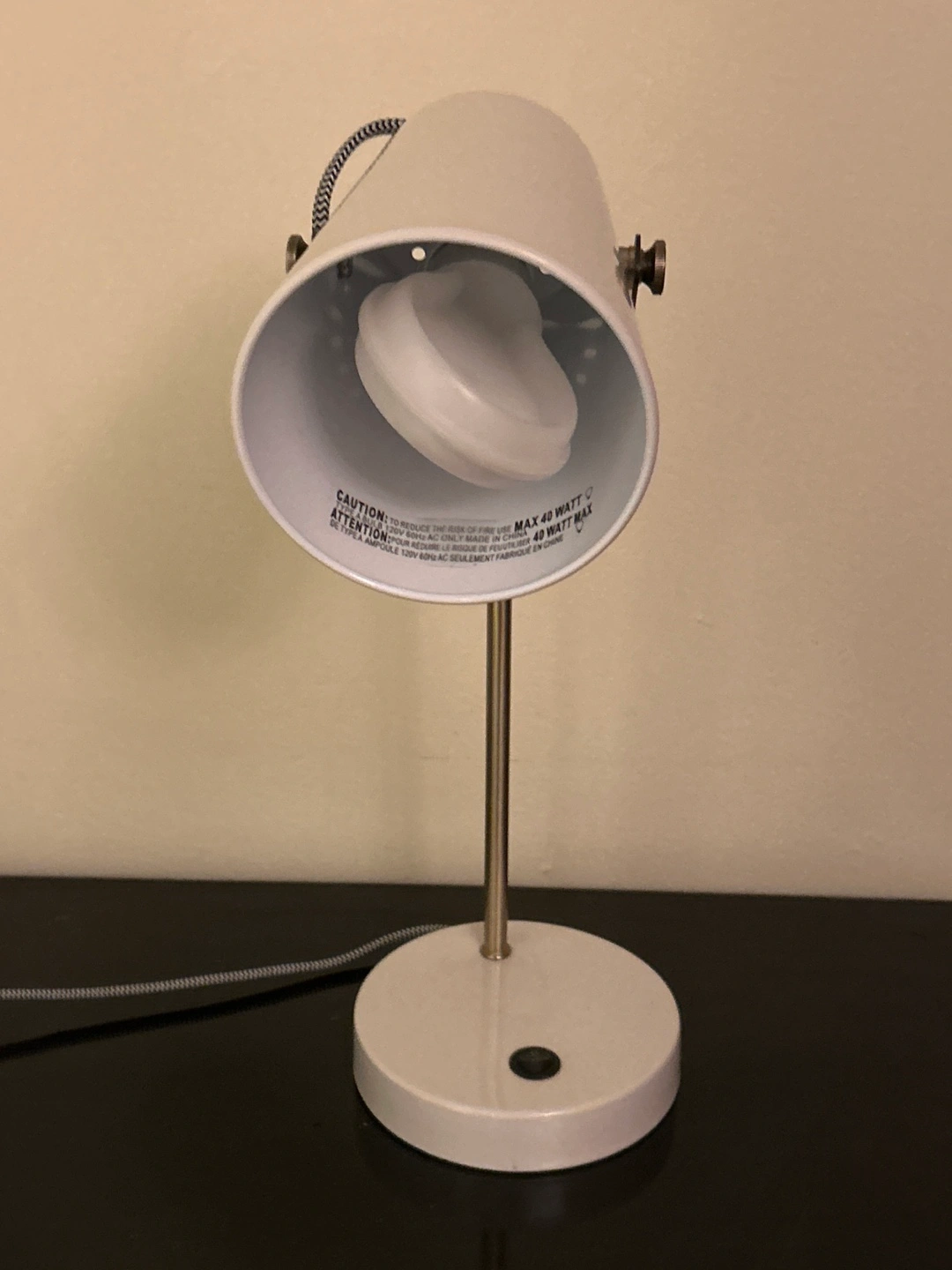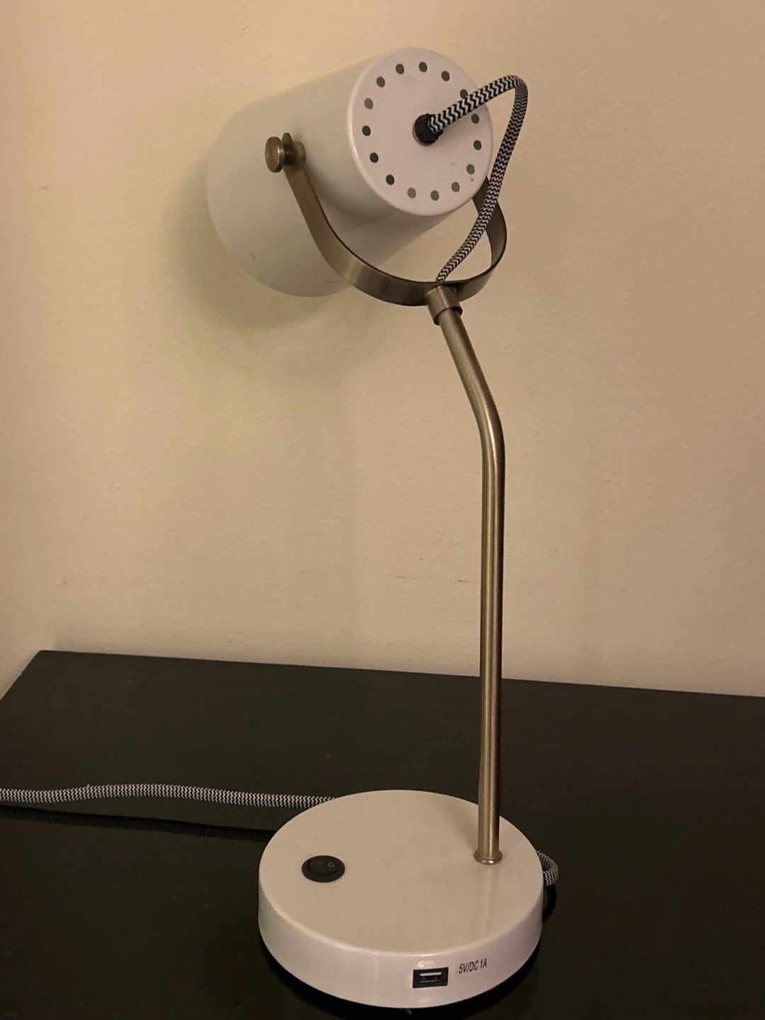 Small white desk lamp. Stainless steel toned metal arm and white base. Swivel arm can go full circle. Light fixture can go up and down and in the middle, adjustable to point light wherever needed. USB port on the base. Max 40-watt bulb.