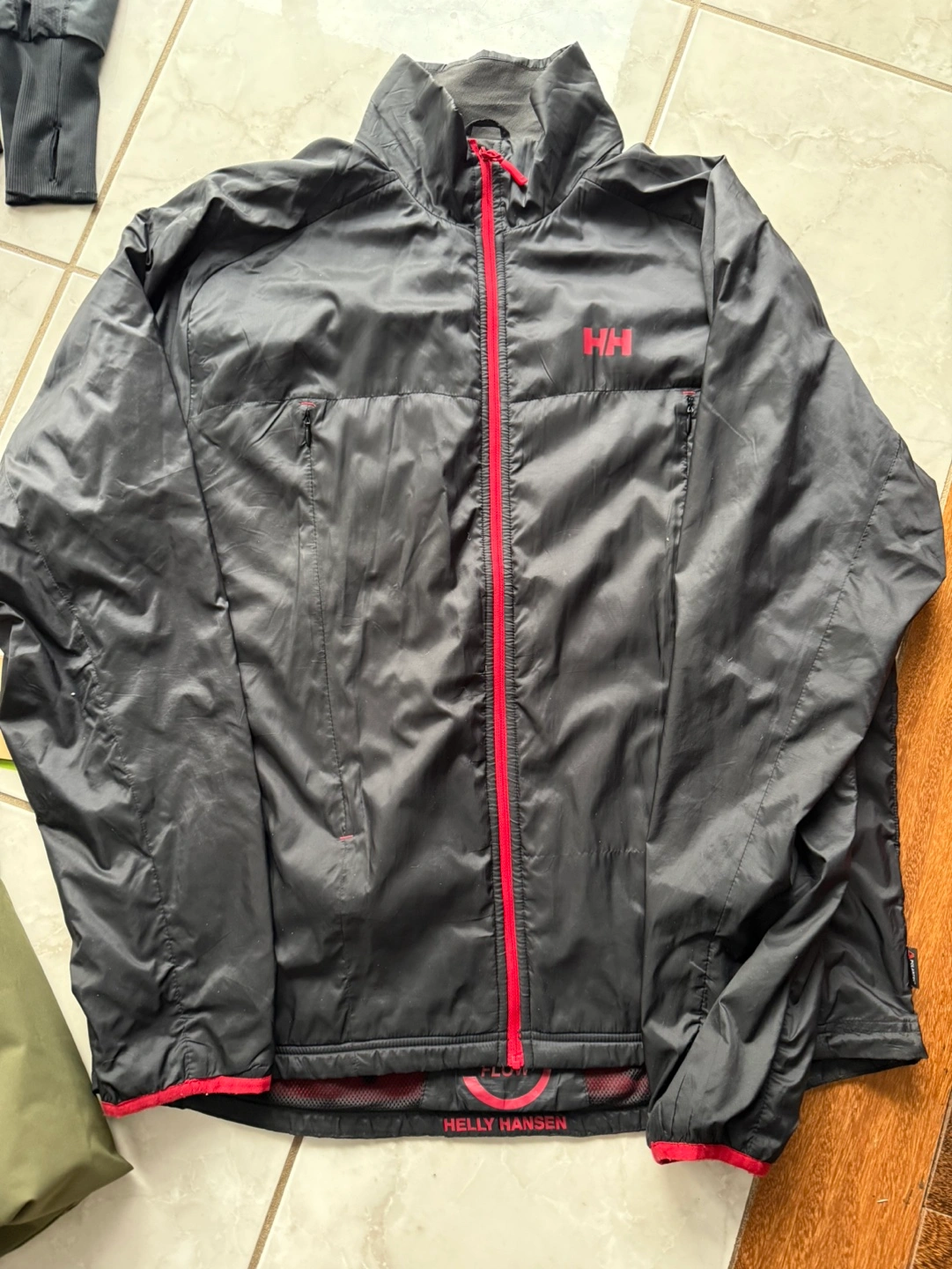 Lightweight running jacket. Features a full zip closure, red zipper, and mesh lining. Excellent for layering.