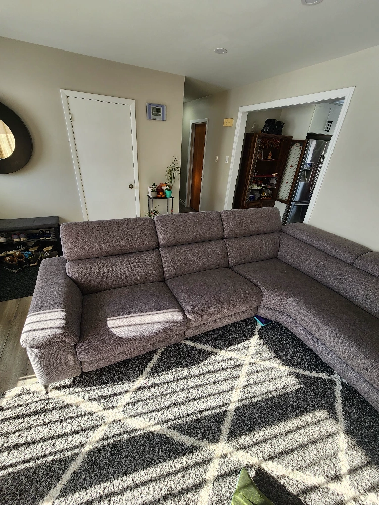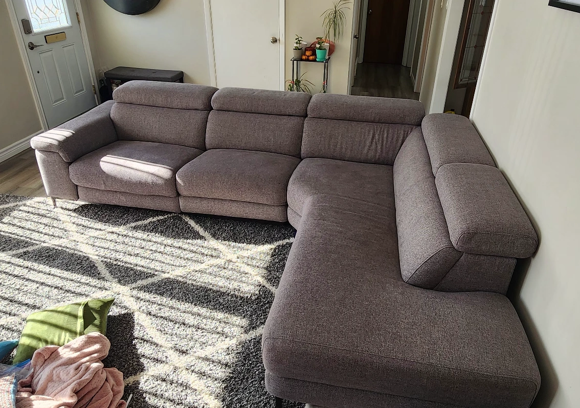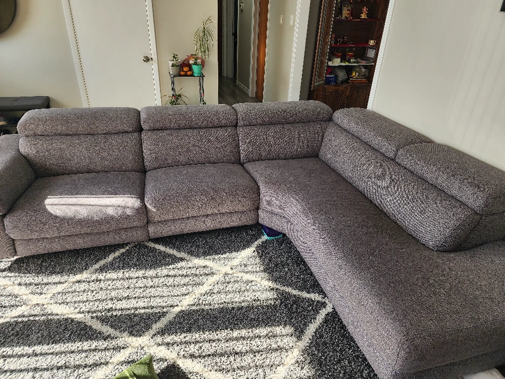 Large grey fabric sectional sofa. Reclining mechanism. Modern style. Excellent condition.