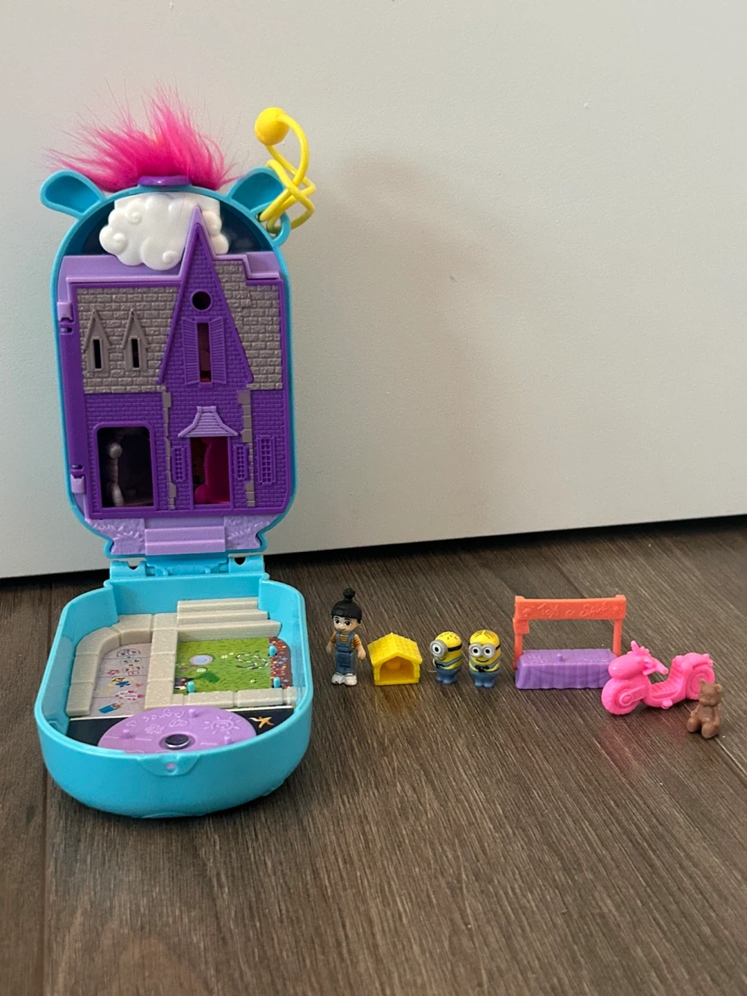 This compact playset features a Minions theme and opens up to reveal a detailed interior. It includes several accessories and figures for imaginative play. The compact itself has a fuzzy top and a unicorn horn accessory.
