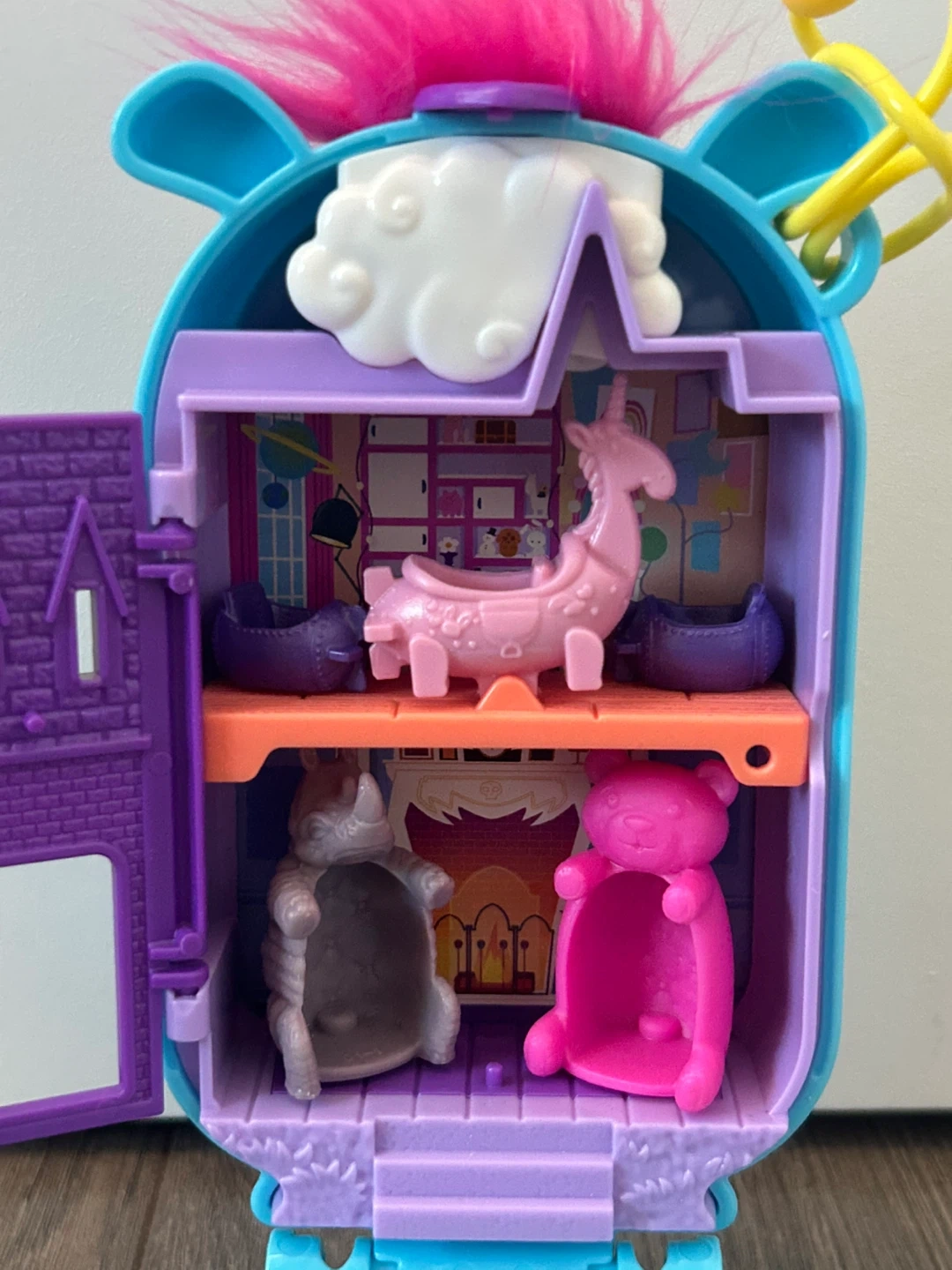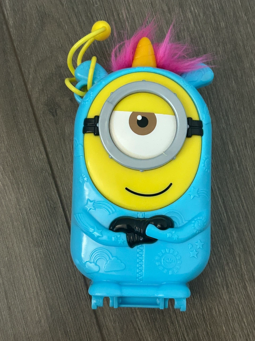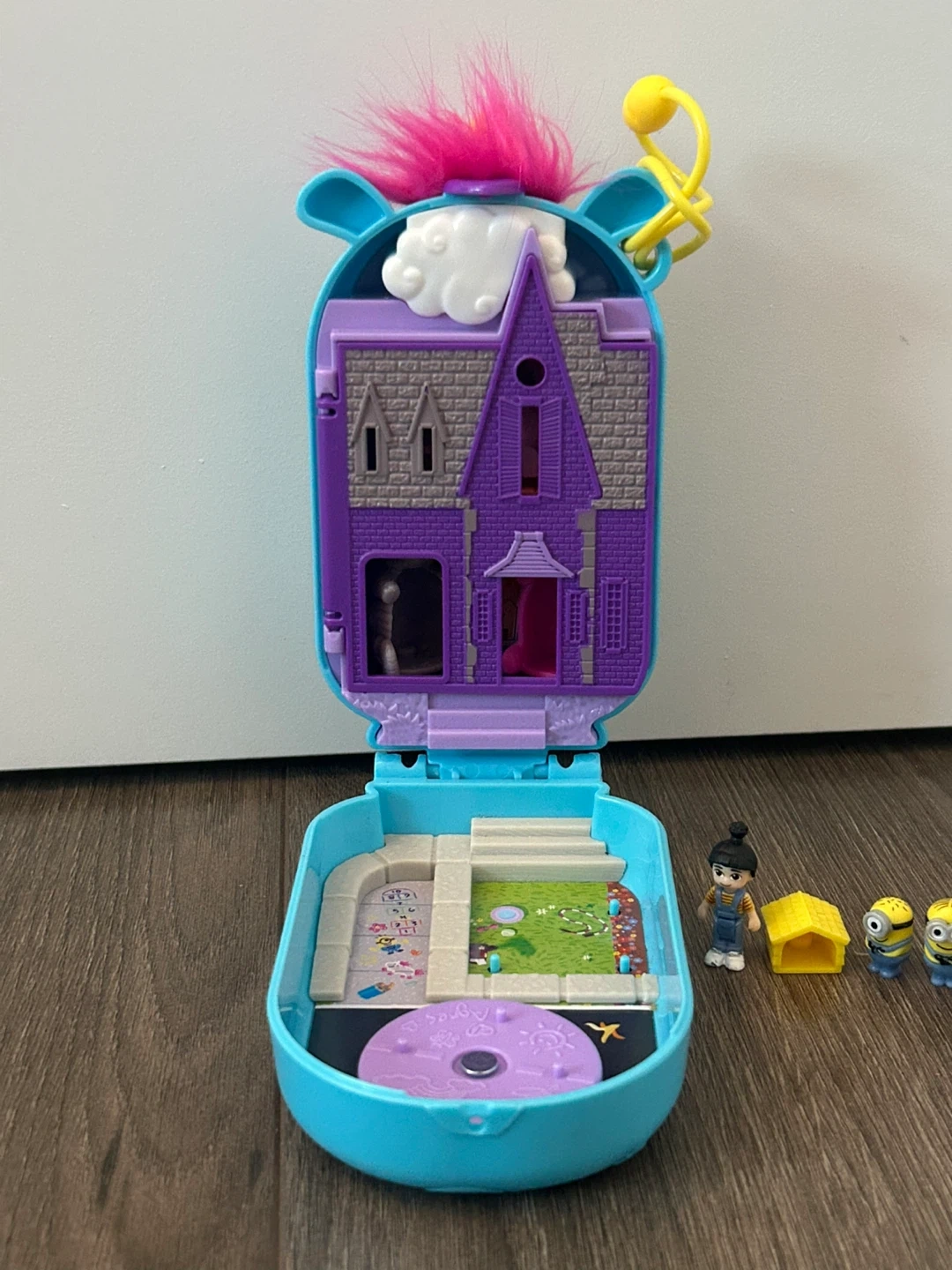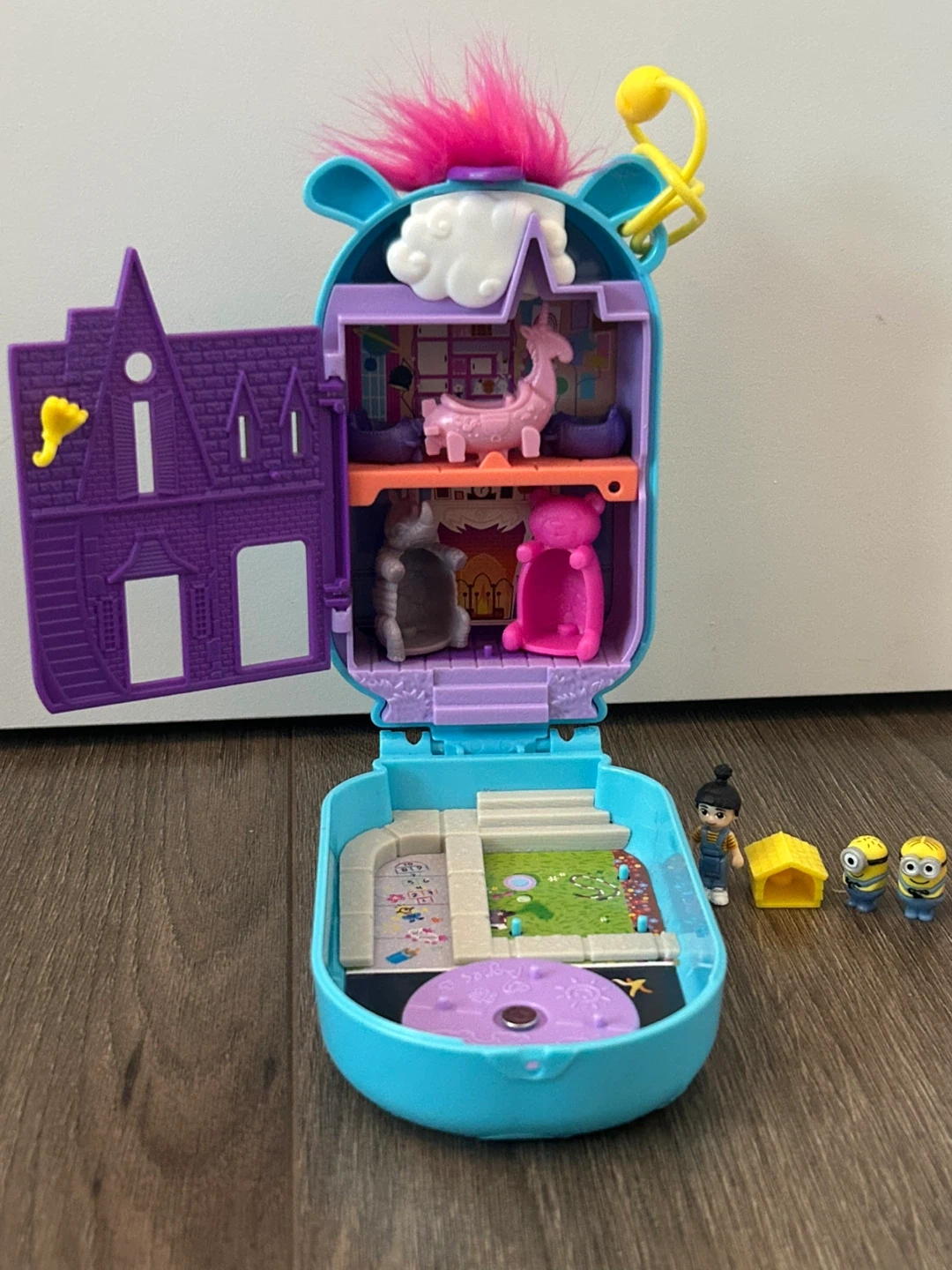 This compact playset features a Minions theme and opens up to reveal a detailed interior. It includes several accessories and figures for imaginative play. The compact itself has a fuzzy top and a unicorn horn accessory.