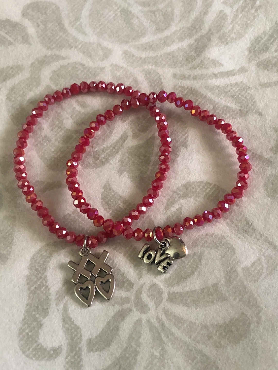 Set of two red beaded bracelets. Each bracelet has a charm. One charm is a heart with the word love, the other is a cross with two hearts. Great for layering.Handmade