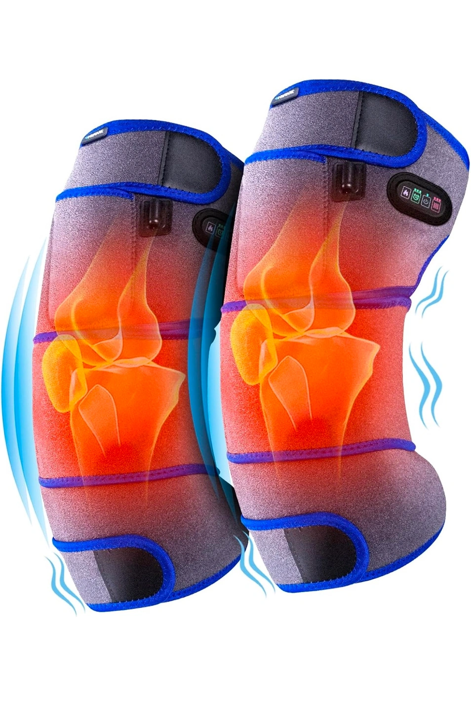 Pair of rechargeable knee wraps. Features heat and vibration. Three heat settings and three massage settings. Includes power adapter and rechargeable battery. Large heating area.