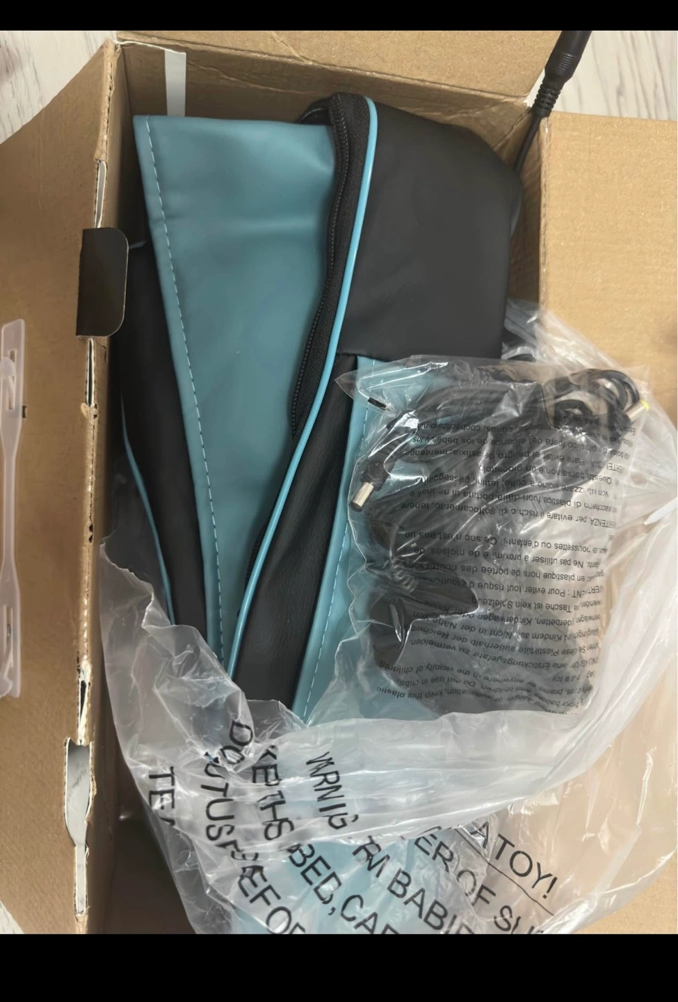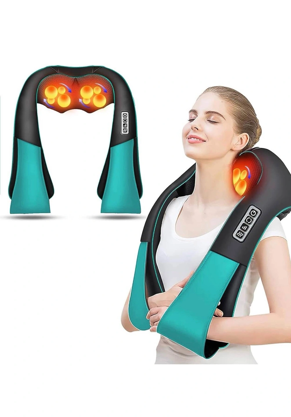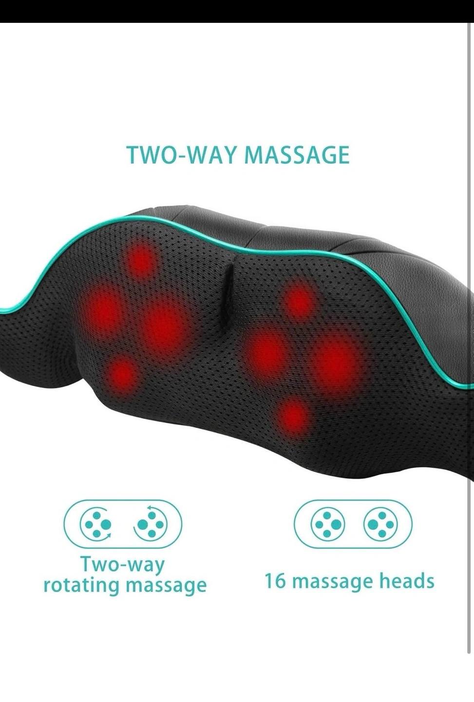 Multifunctional massager with heat. 16 massage heads. Two-way rotating massage. Adjustable intensity. Smart button controls. Used for neck, back, legs, and more. Includes power adapter.