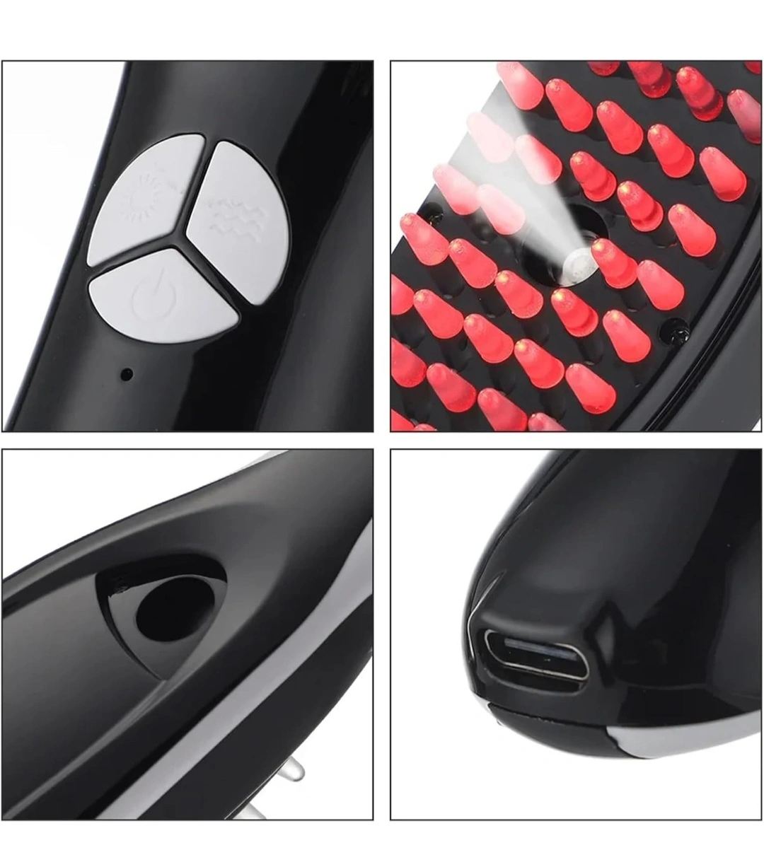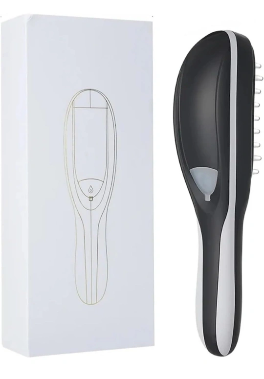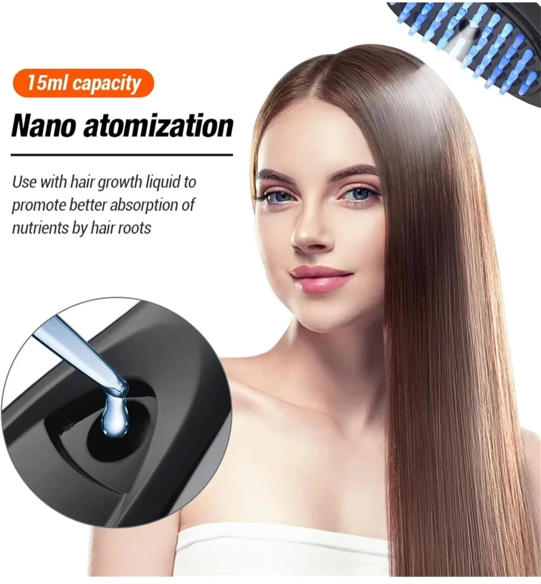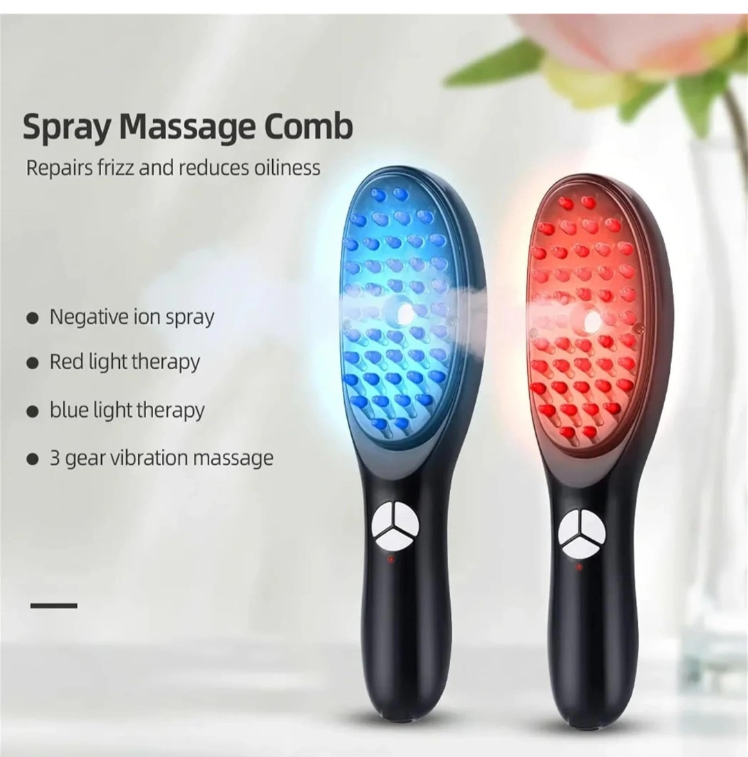 Electric massage comb. Features red and blue light therapy, vibration massage, and nano atomization. Reduces hair oil and loss. Improves hair follicle metabolism. Promotes blood circulation. 15ml capacity. Helps hair growth.
