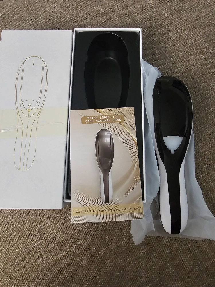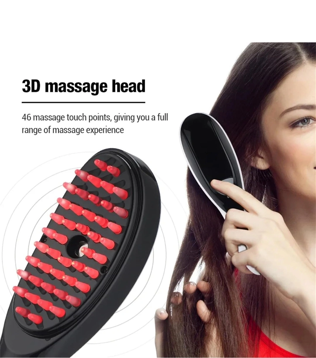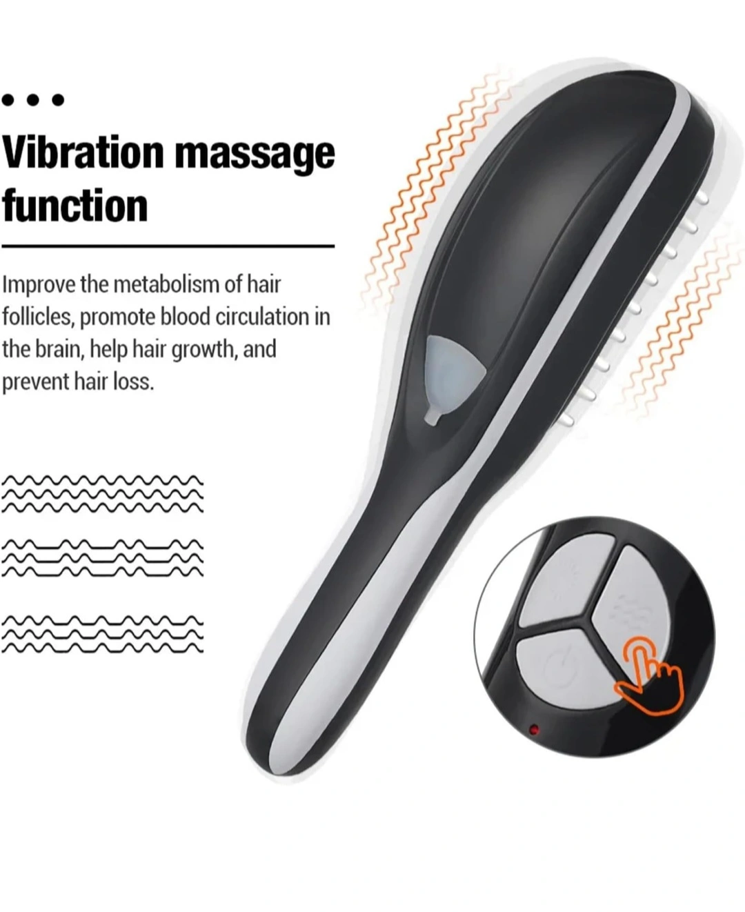 Electric massage comb. Features red and blue light therapy, vibration massage, and nano atomization. Reduces hair oil and loss. Improves hair follicle metabolism. Promotes blood circulation. 15ml capacity. Helps hair growth.