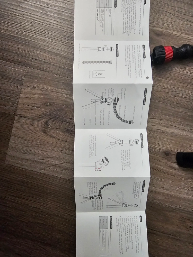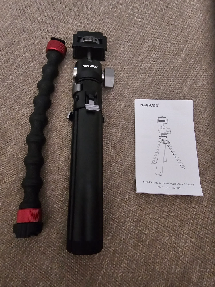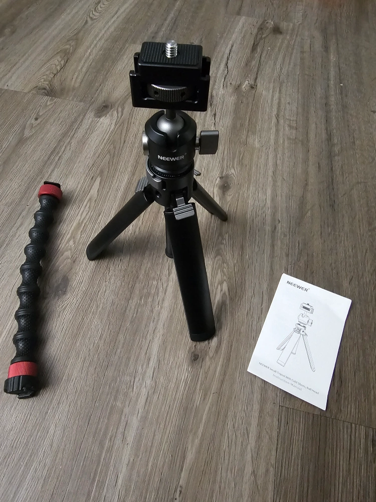 Mini tripod, ball head, and flexible phone holder. Perfect for travel or vlogging. Includes instruction manual.