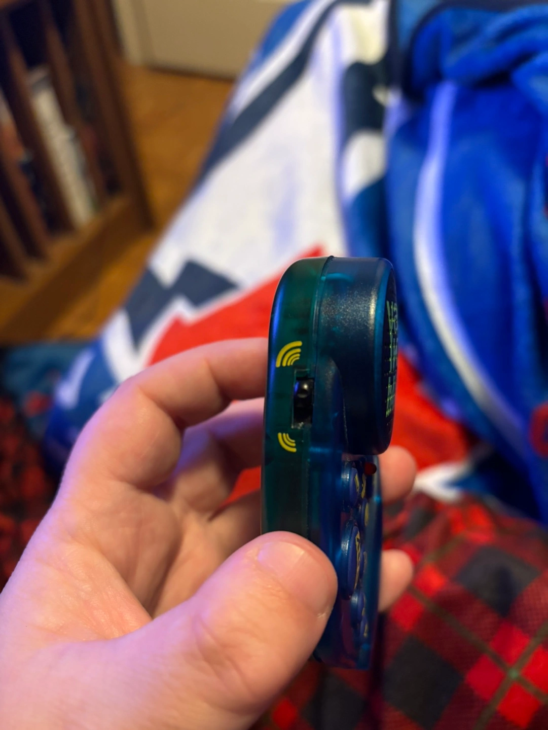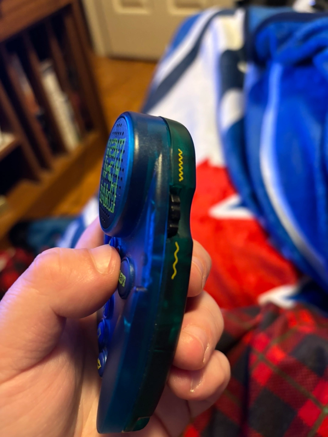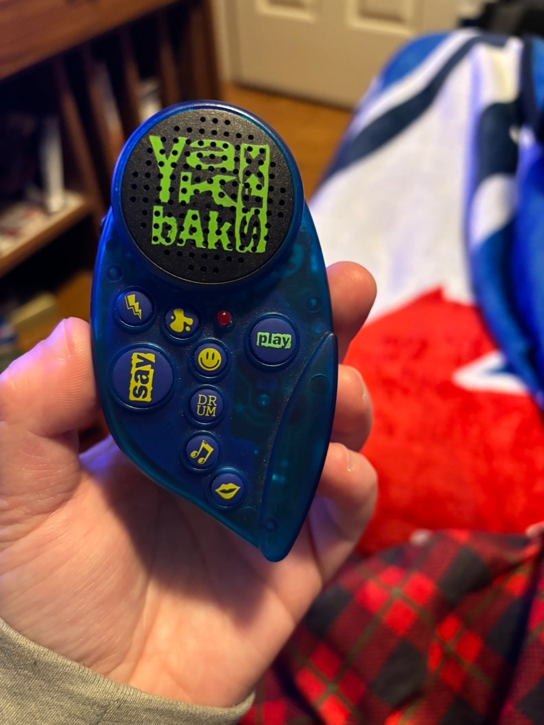 44Blue plastic handheld toy. Features various sounds and phrases. Buttons include play, say, drum, and musical notes.