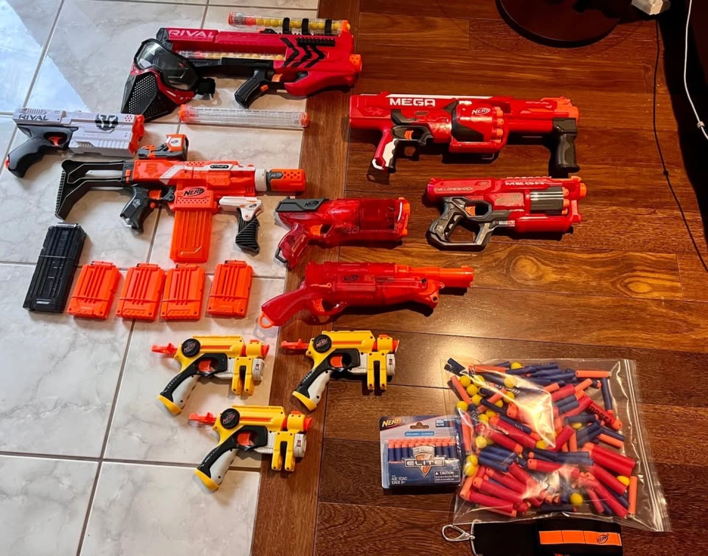 Nerf blaster lot. Includes multiple Mega and Rival blasters, numerous magazines, darts, and a mask. Great for Nerf battles! All cleaned, checked and fully functioning.