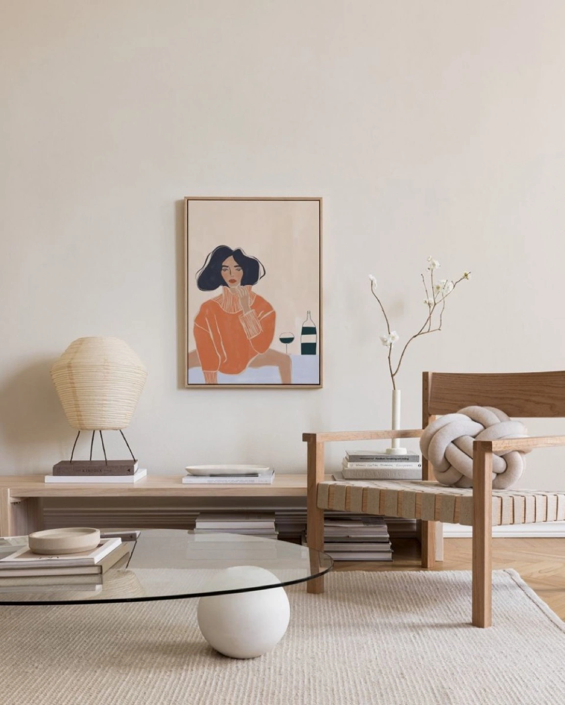 10Canvas print featuring a woman in a sweater with wine. Neutral colours. Modern art. Perfect for adding a touch of elegance to your space. Original Price 159$ ( refer Desenio website)