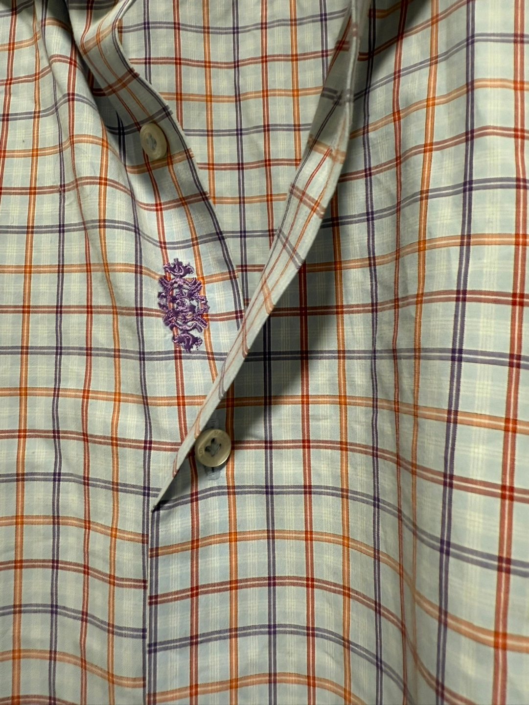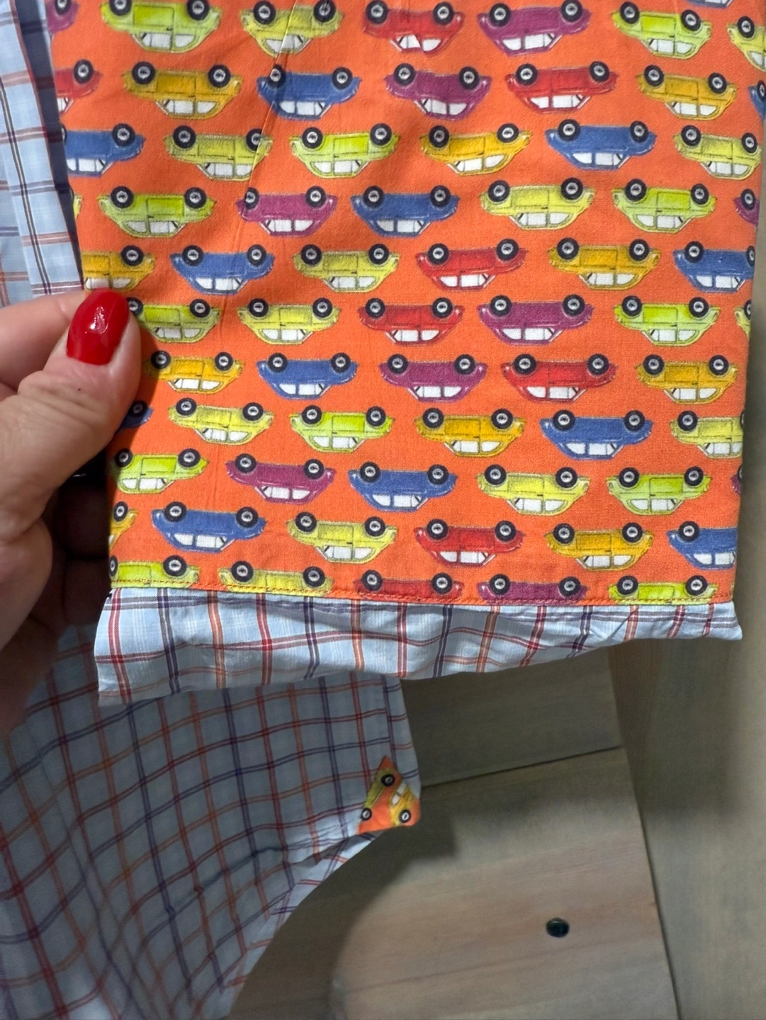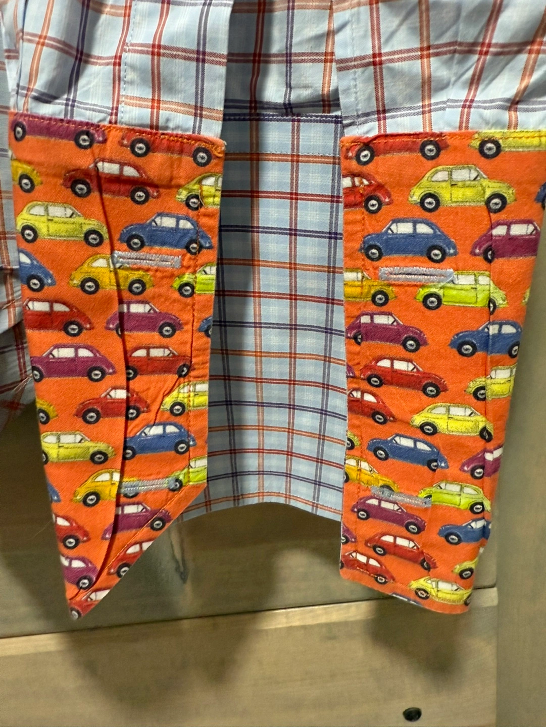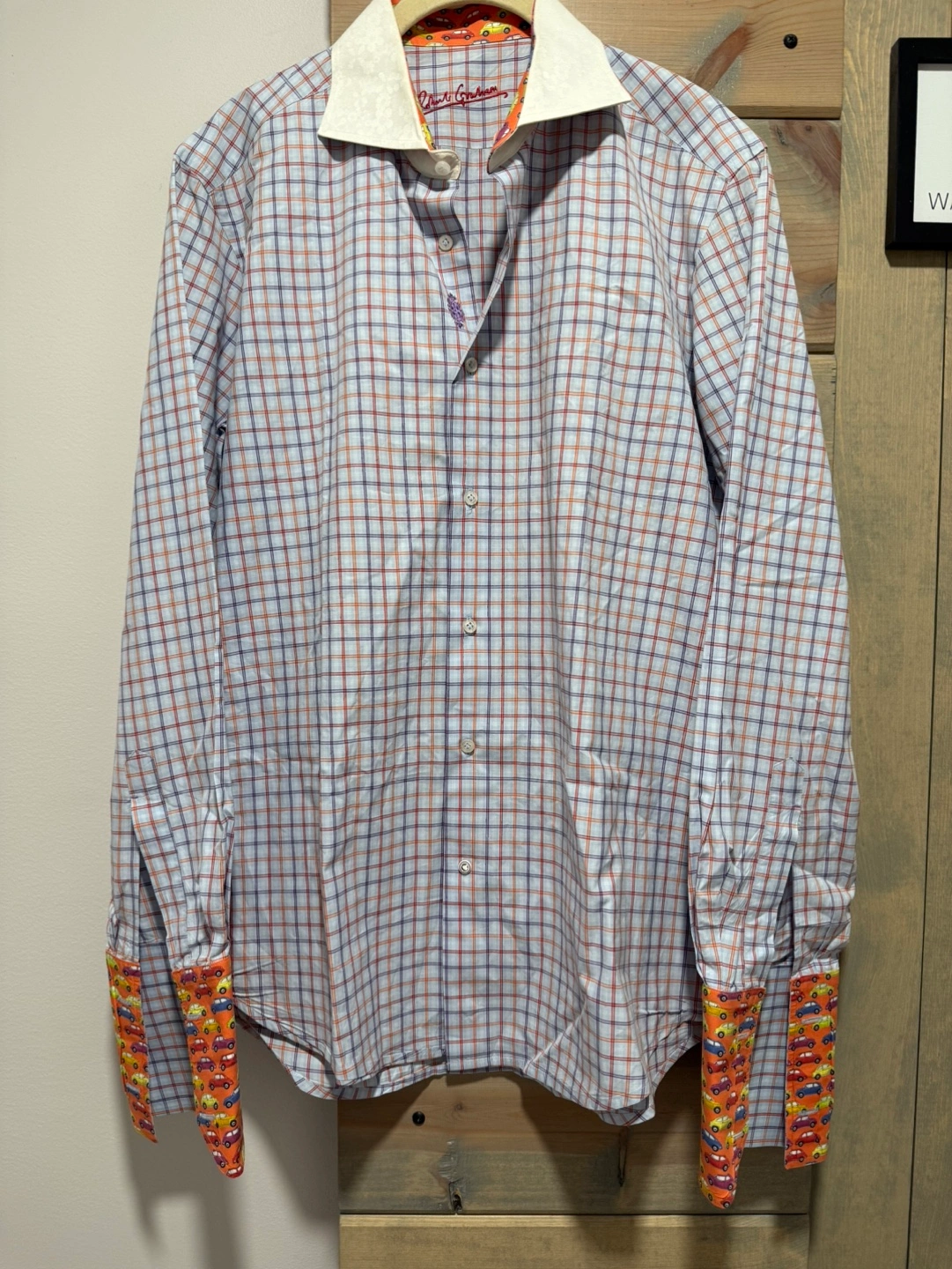 Men's long-sleeve button-down shirt. Features a light blue, red, and purple plaid pattern. Orange and white contrast accents inside the collar and cuffs. A whimsical car print lines the collar and cuffs. Robert Graham logo embroidered inside the collar.