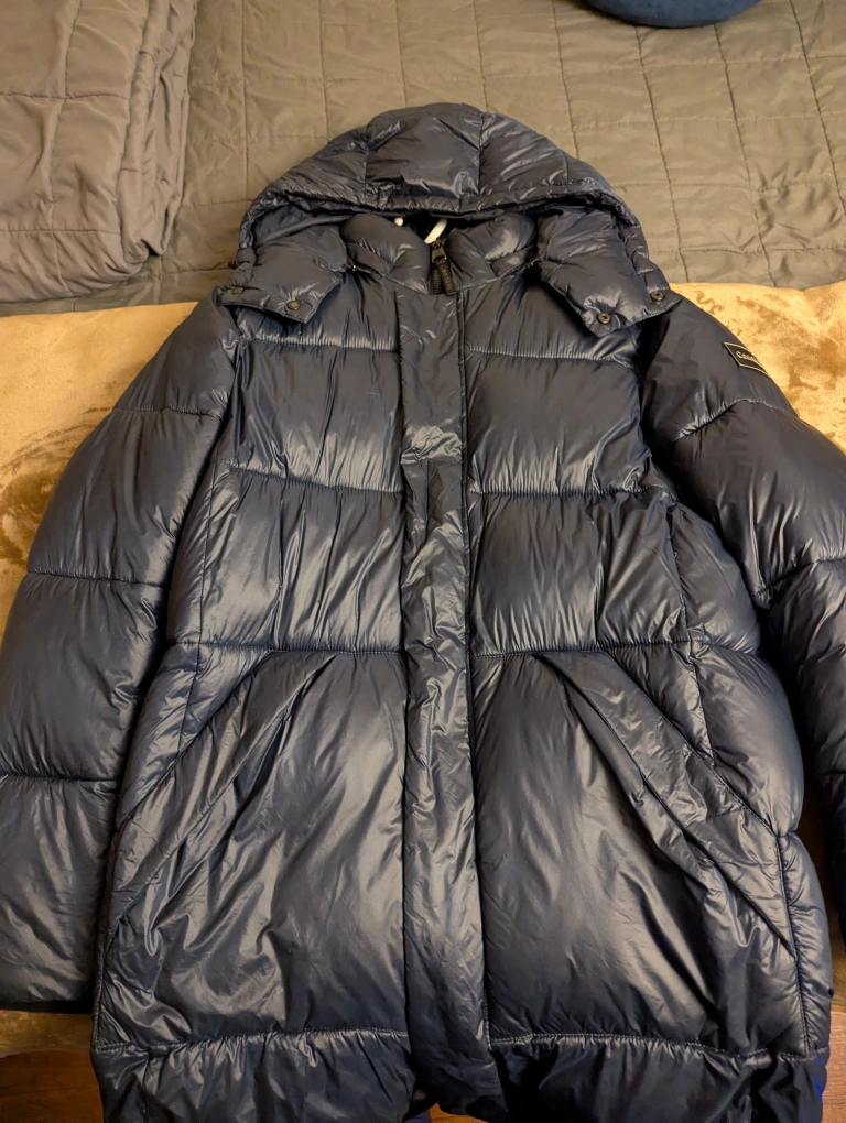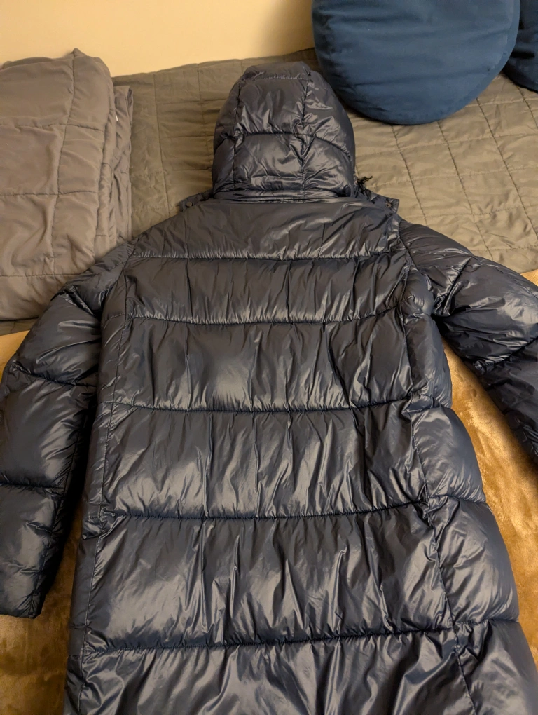 147Warm winter jacket. Features a hood and zipper closure. Excellent condition. Suitable for colder weather.