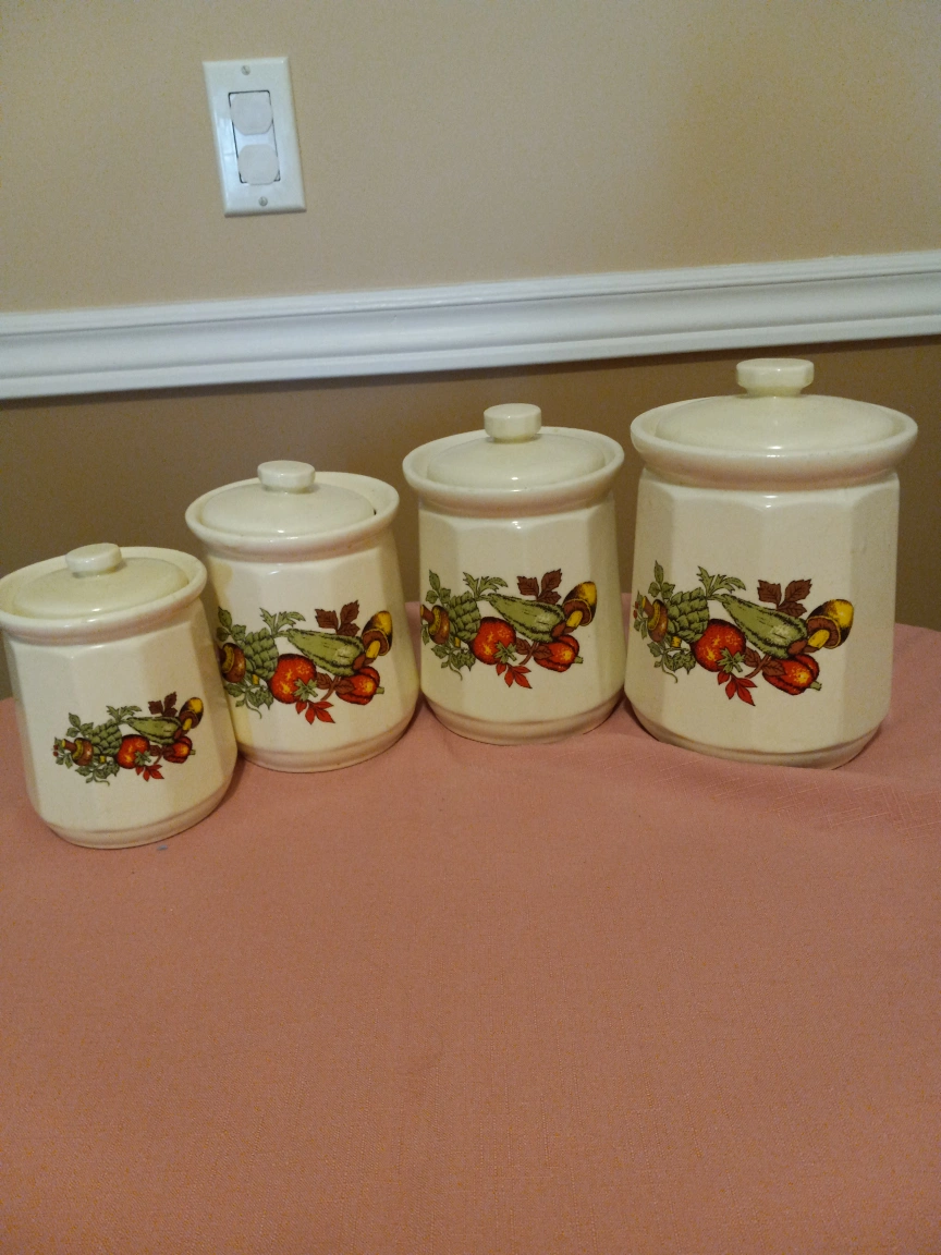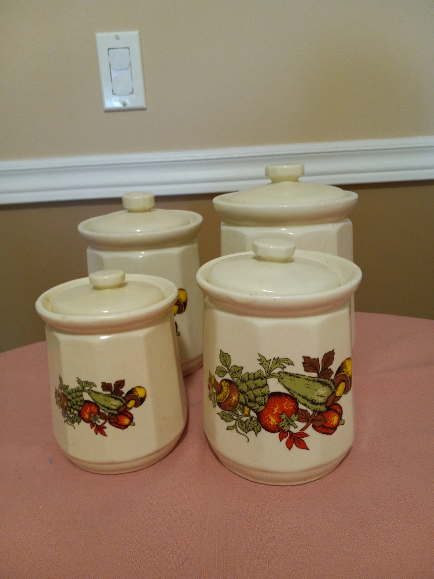 Set of four kitchen canister, cream color ceramic with vegetable design. Various sizes. Perfect for storing sugar, flour, coffee, tea, etc.