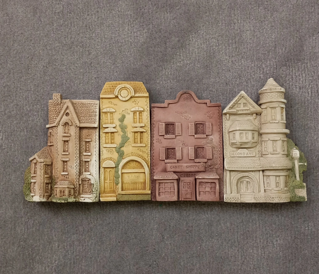 Plaster of Paris Victorian houses mounted on a board for hanging. 4 different houses measures approx 16.5 by 7.25 inches. One very small chip on roof of second house.