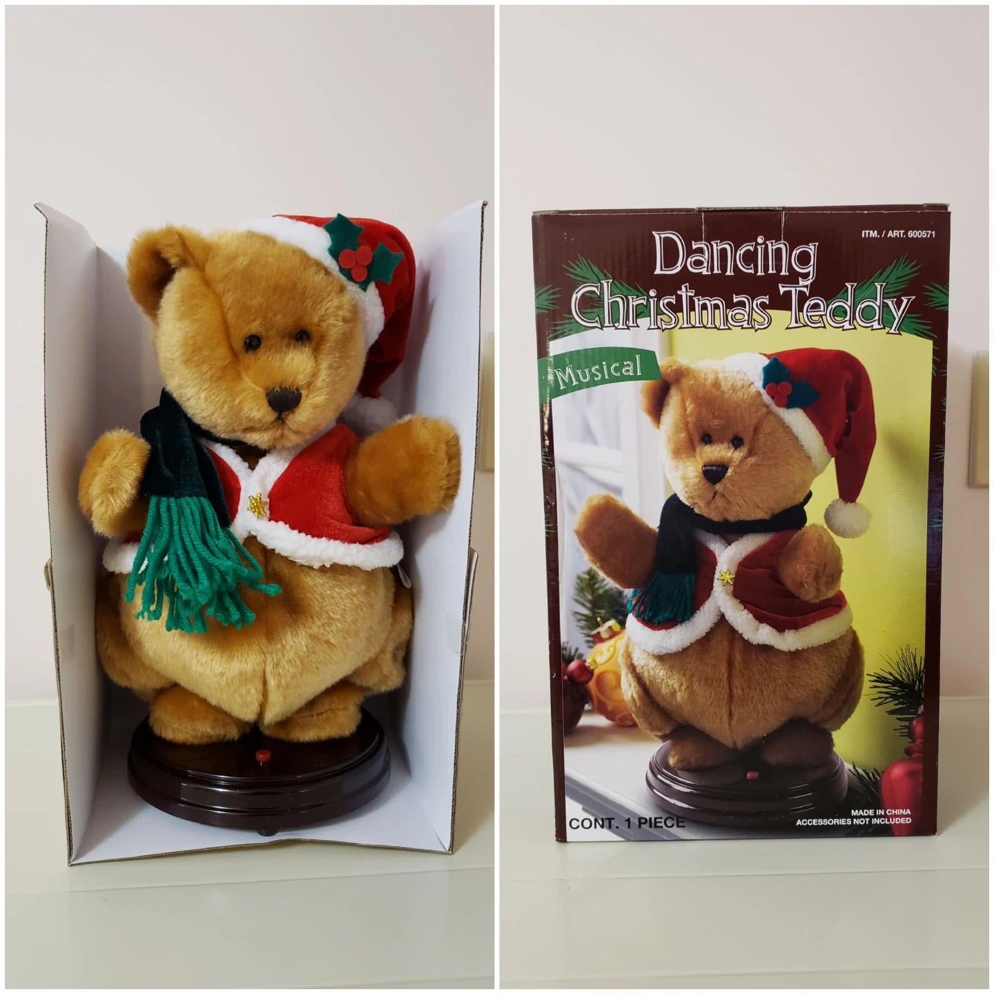 It's a musical dancing teddy bear, it plays "Rocking' around the Christmas Tree"