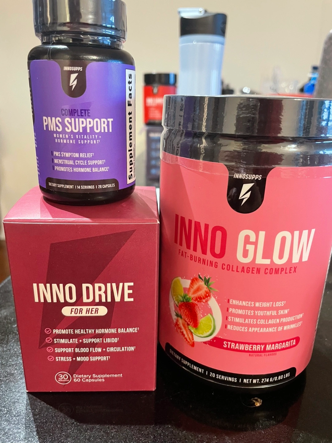 Bundle of Innosupps supplements. Includes PMS support capsules for women's vitality and hormone support, and Inno Glow fat-burning collagen complex in Strawberry Margarita flavour. Dietary supplements. Unused, still sealed in packaging. I purchased but have not been able to use.