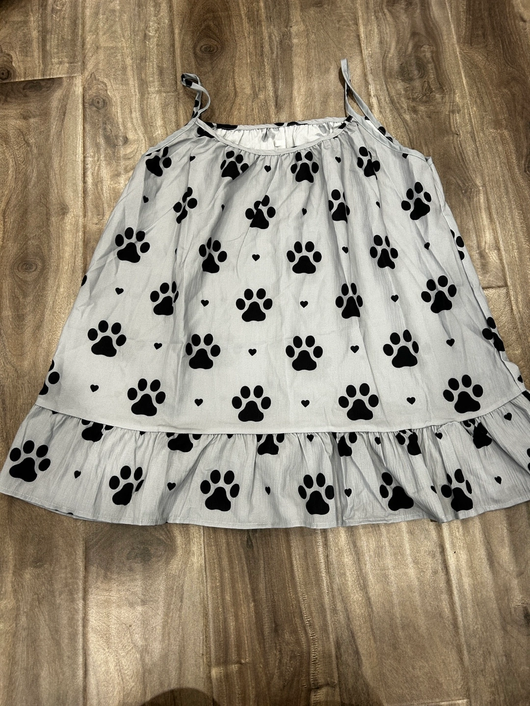 Cute grey sleeveless tank top. Features a ruffled hem and black paw print pattern. Small hearts scattered throughout.