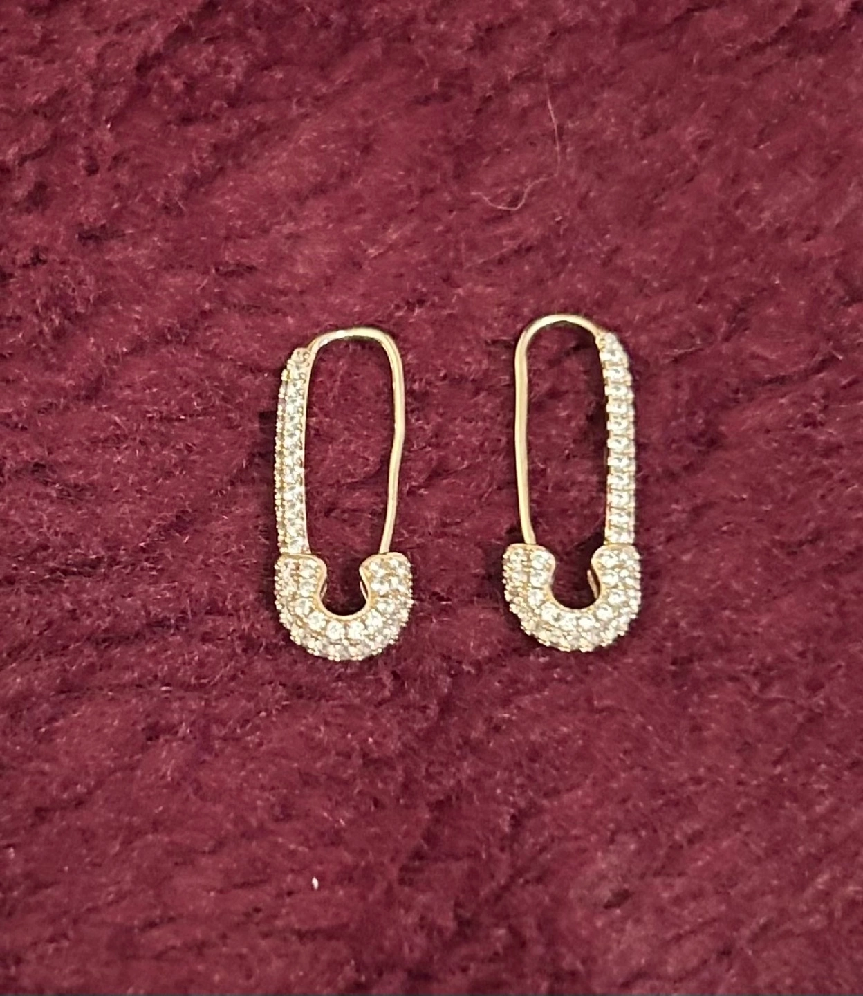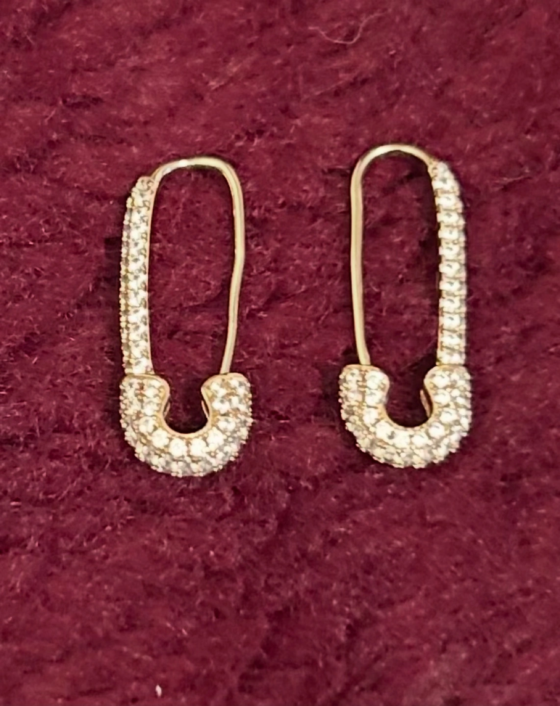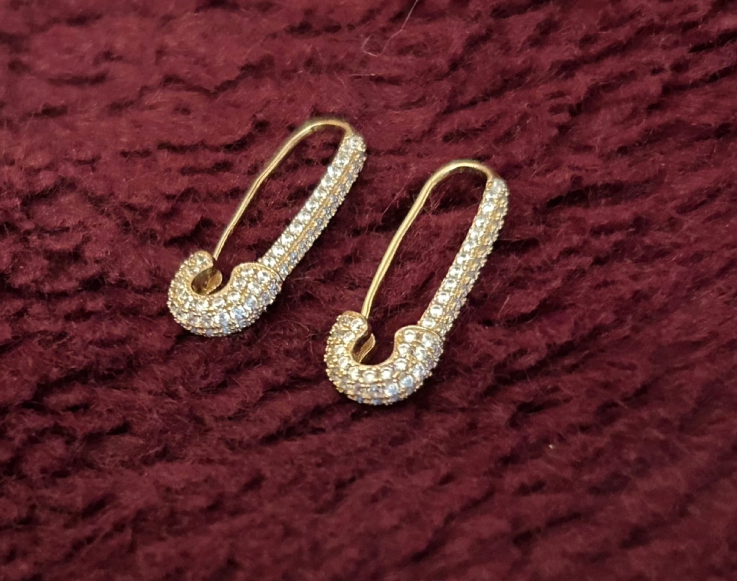 Pair of gold 14kt gold filled over 925, safety pin earrings. Encrusted with clear cubic zirconia stones. Stylish and trendy.