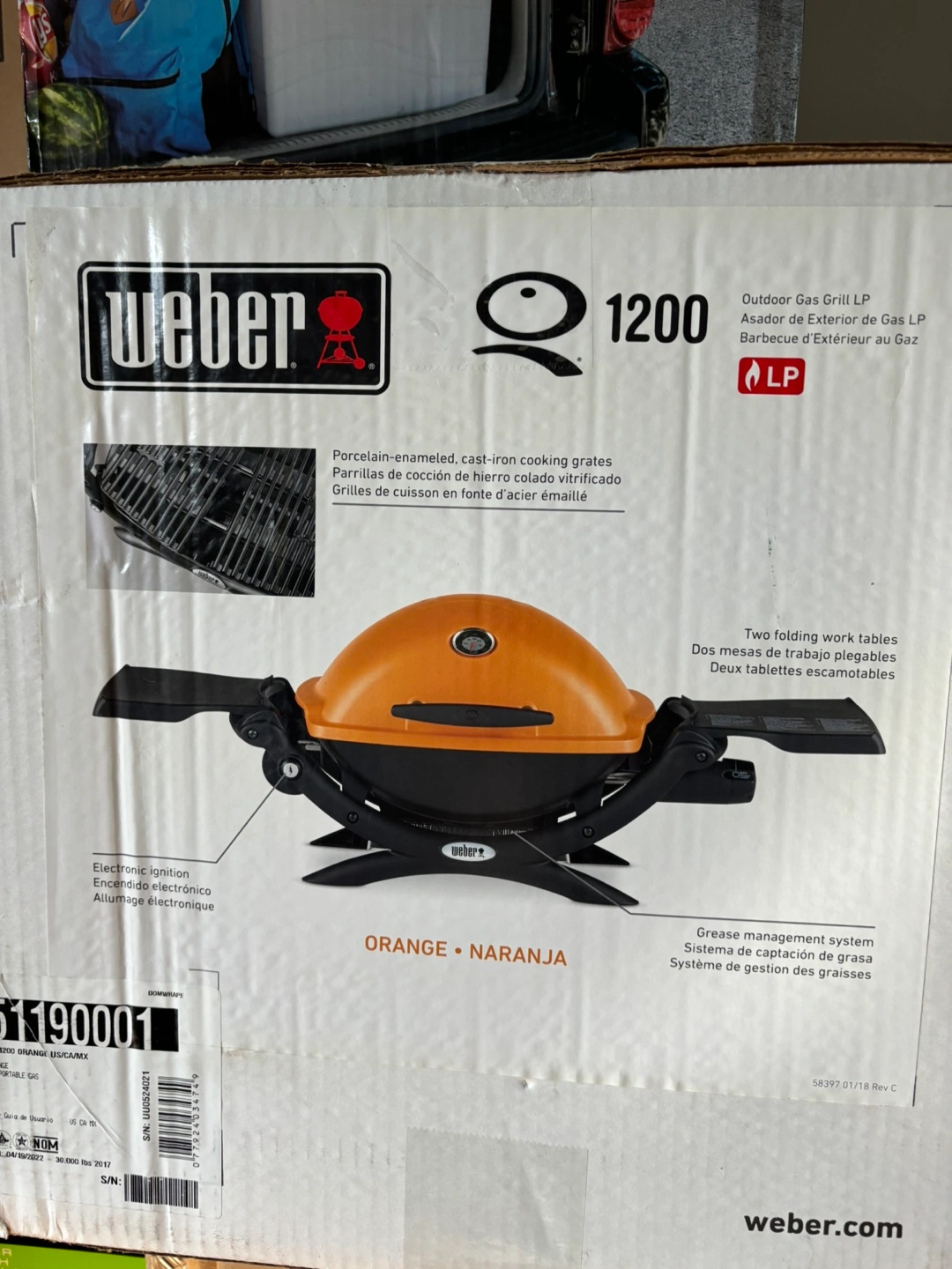 Portable outdoor gas grill. Features porcelain-enameled cast-iron cooking grates, electronic ignition, two folding work tables, and a grease management system. Orange.