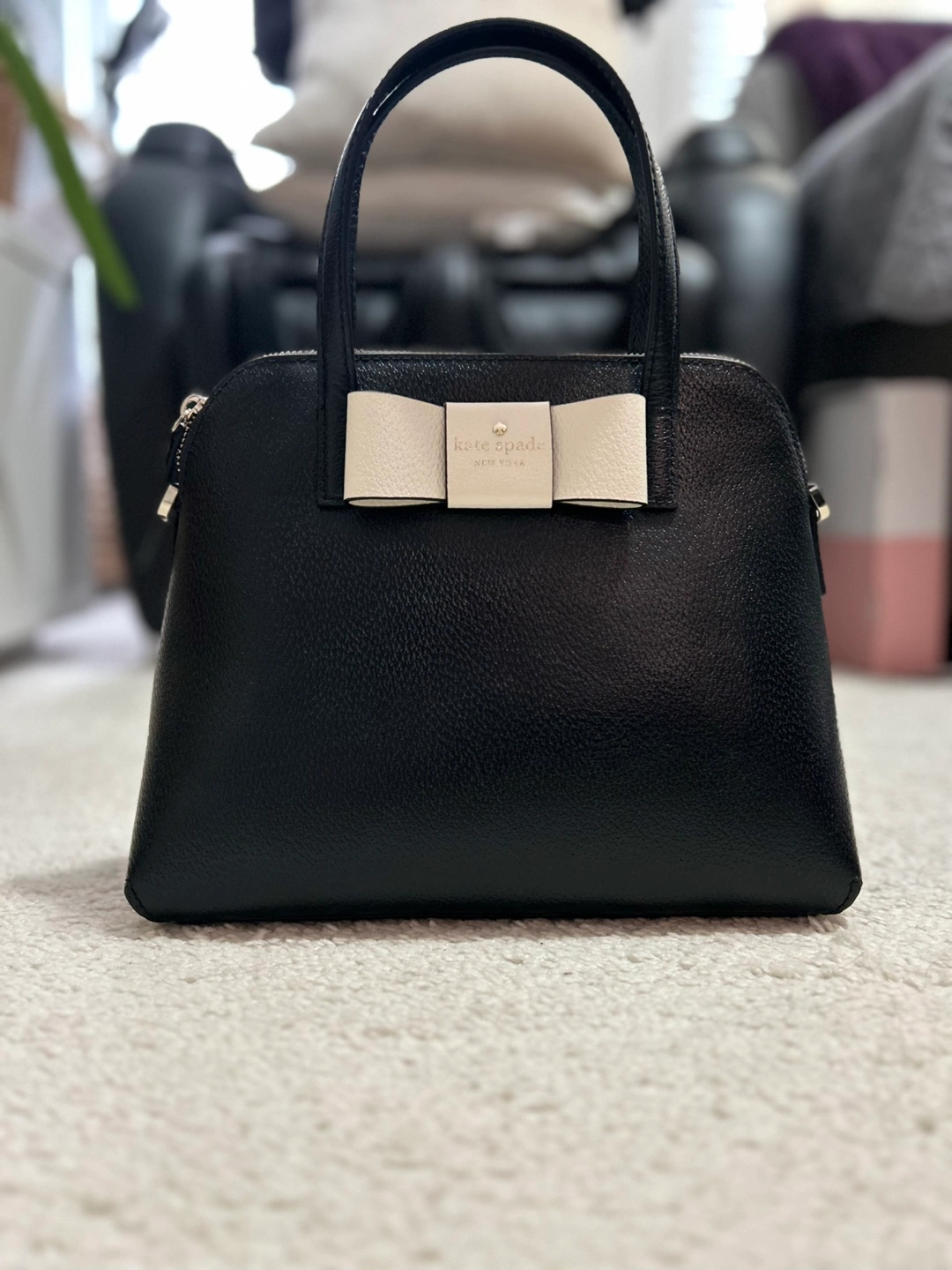 Pre-owned Kate Spade New York handbag. Black pebbled leather. Bow detail. Top handle and zip closure. Excellent condition and never used. Selling it for half price.
