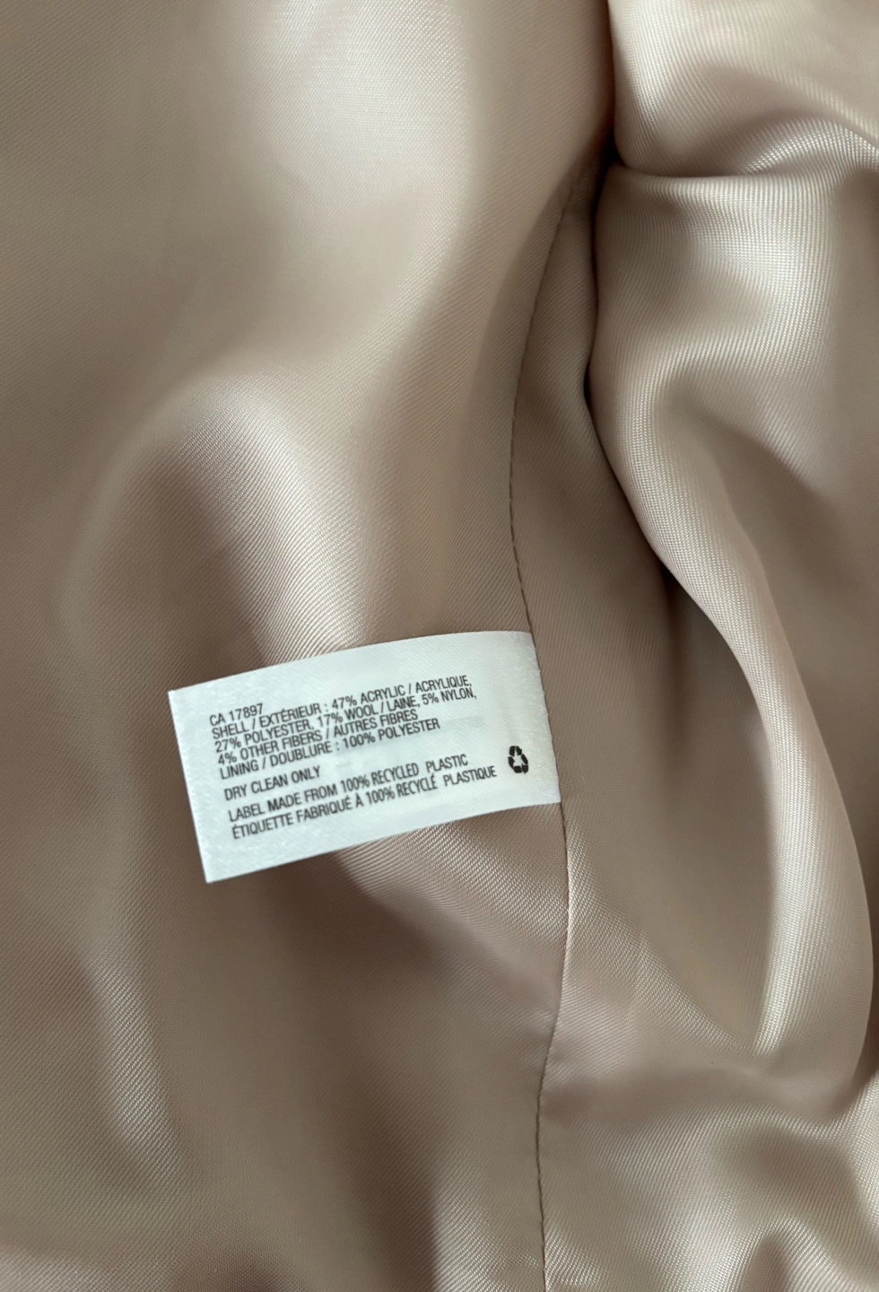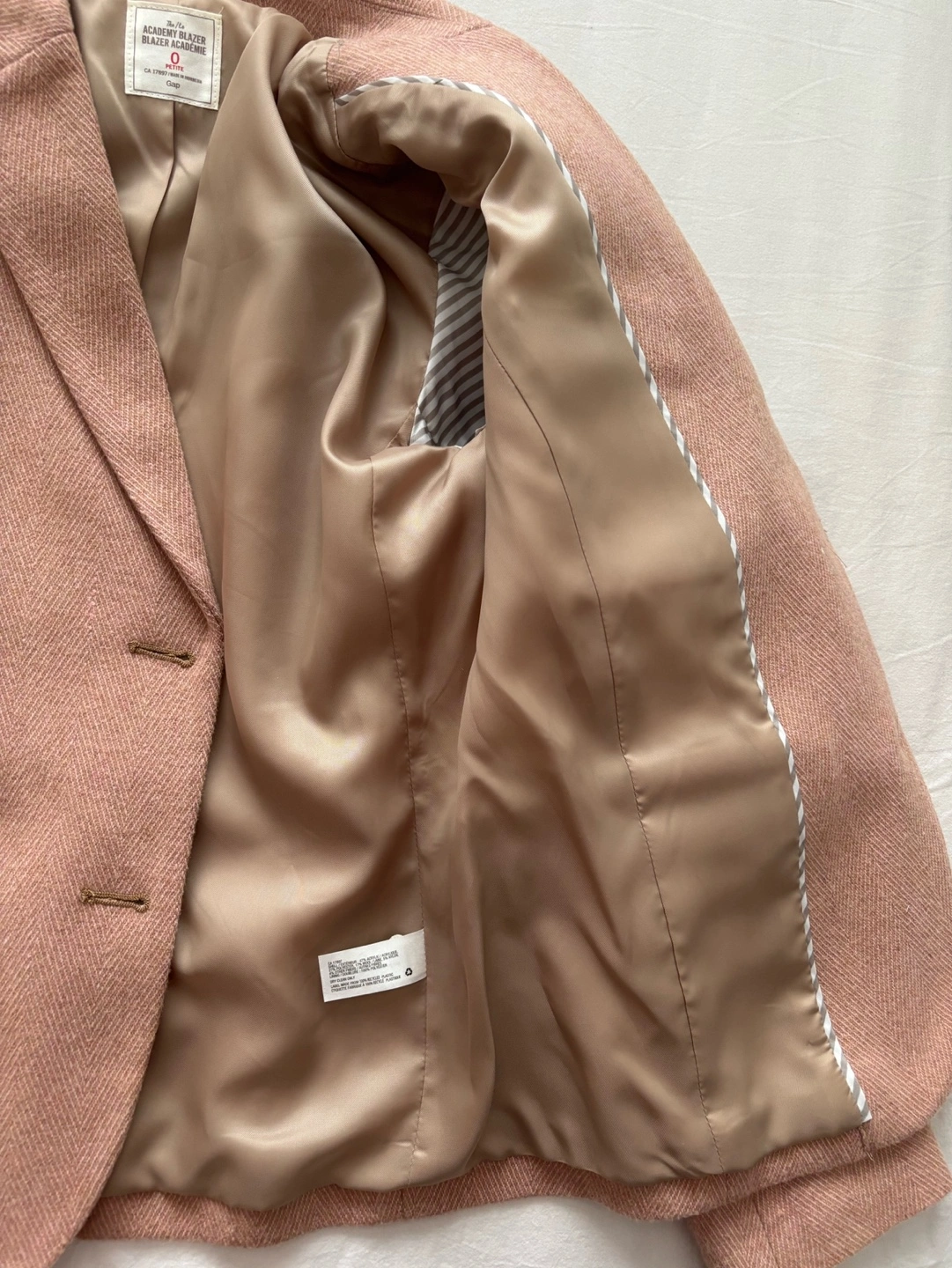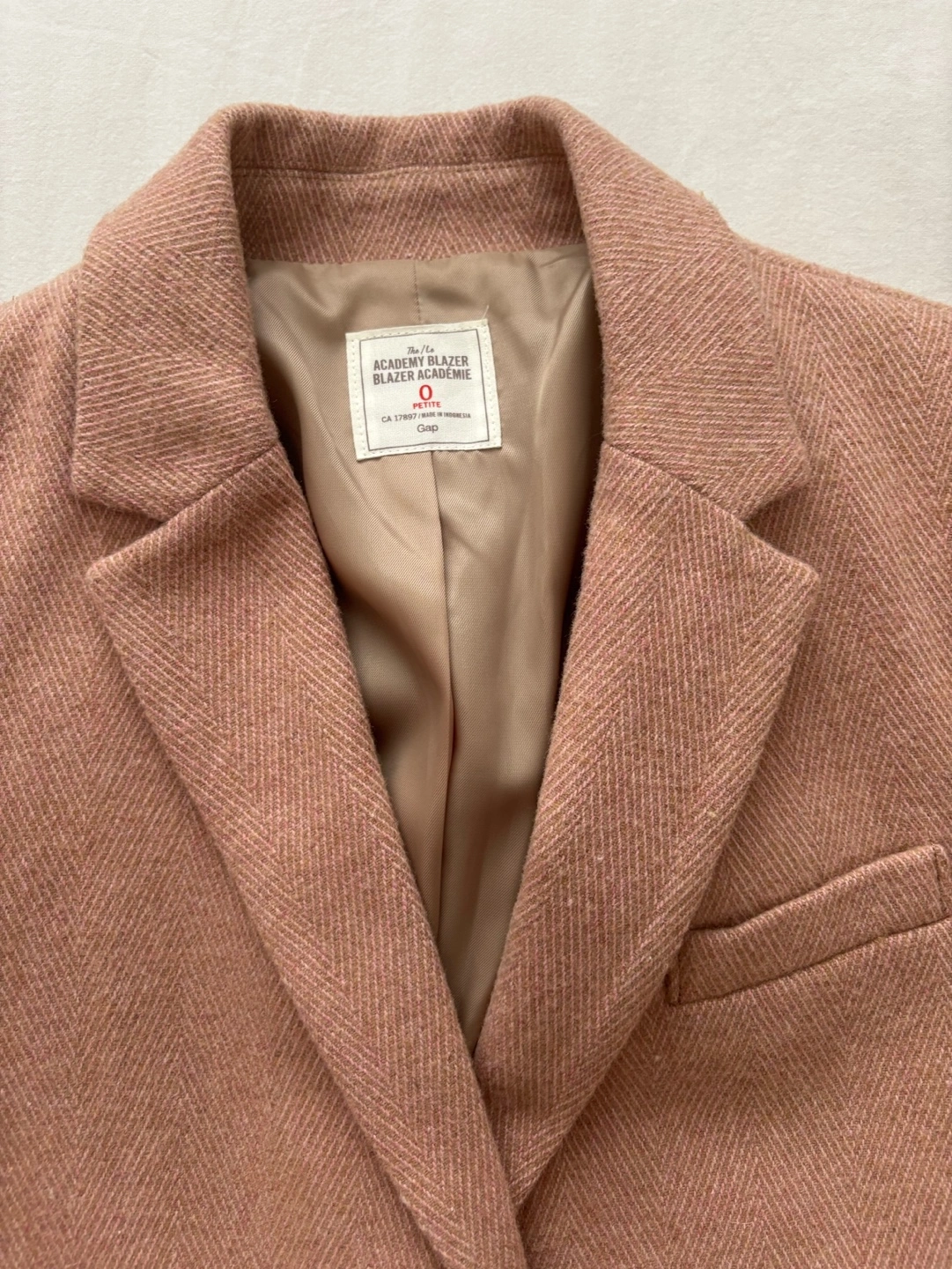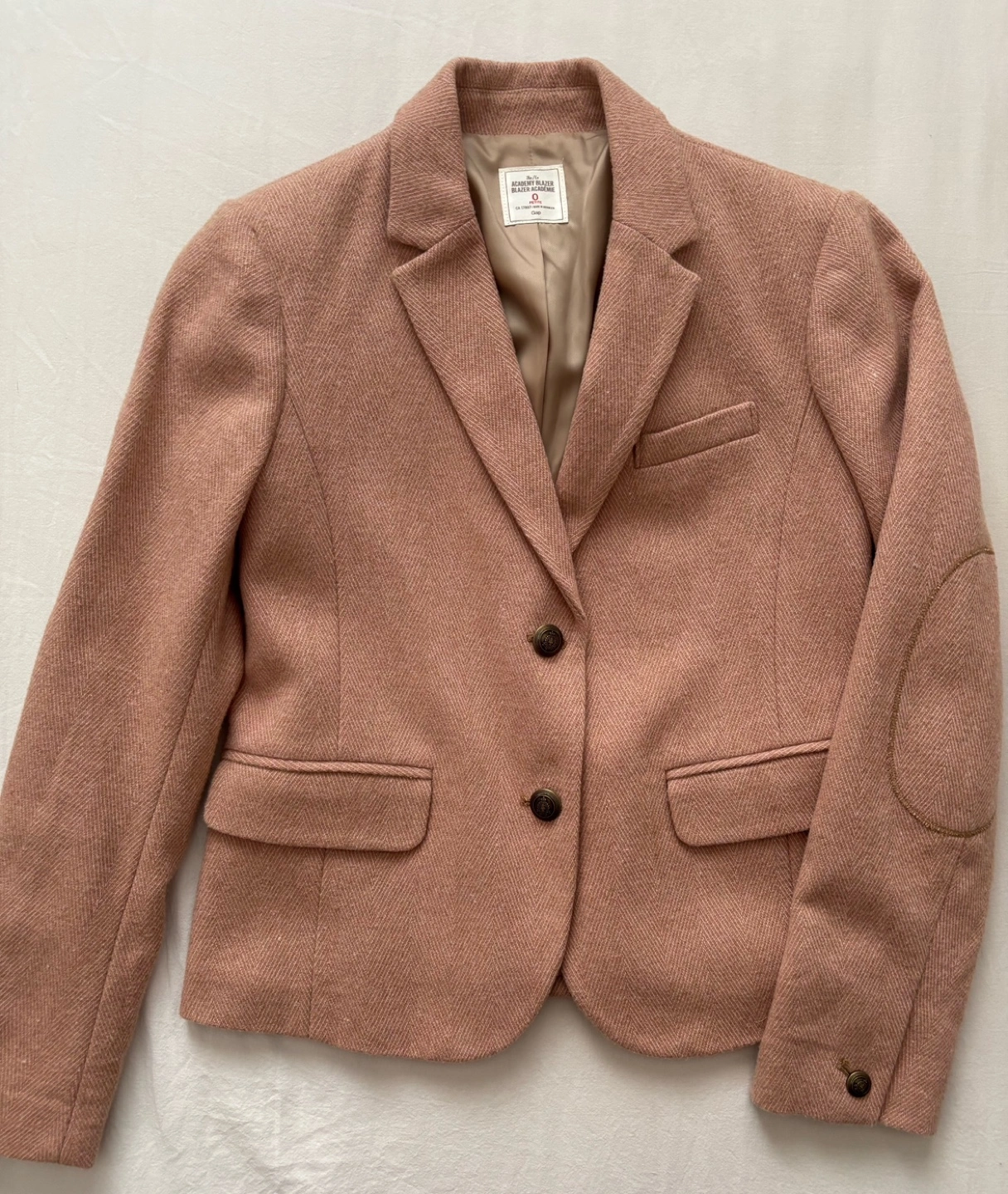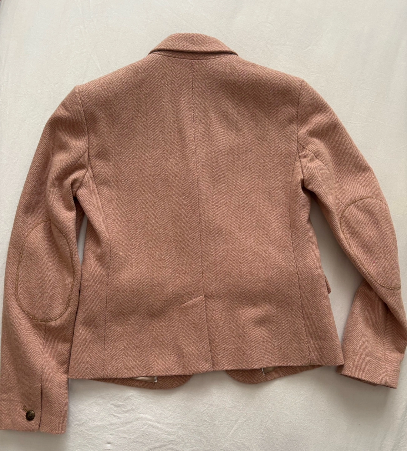 Women's pink blazer. Size 0. Features elbow patches. Herringbone pattern. Fully lined. 17% wool.