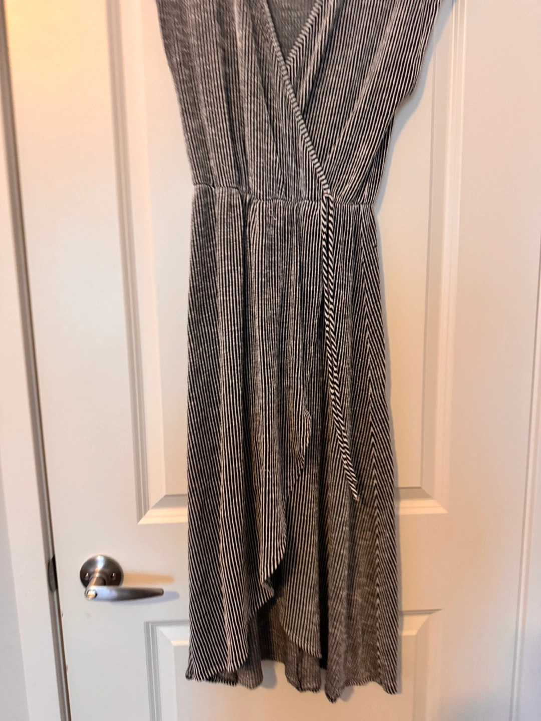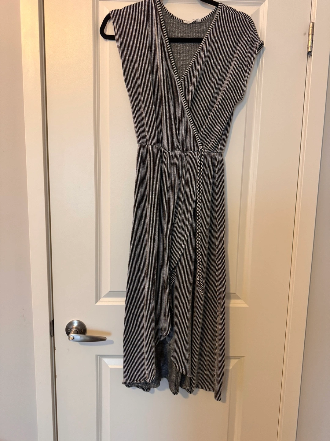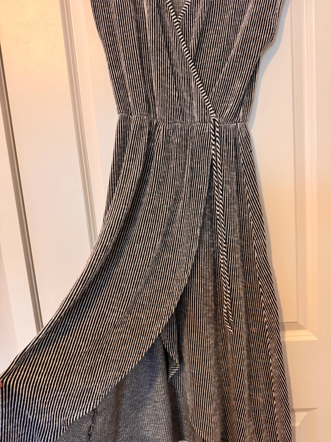 Black and white striped wrap dress. High-low hemline. Short sleeves. Lightweight material. Great for summer.