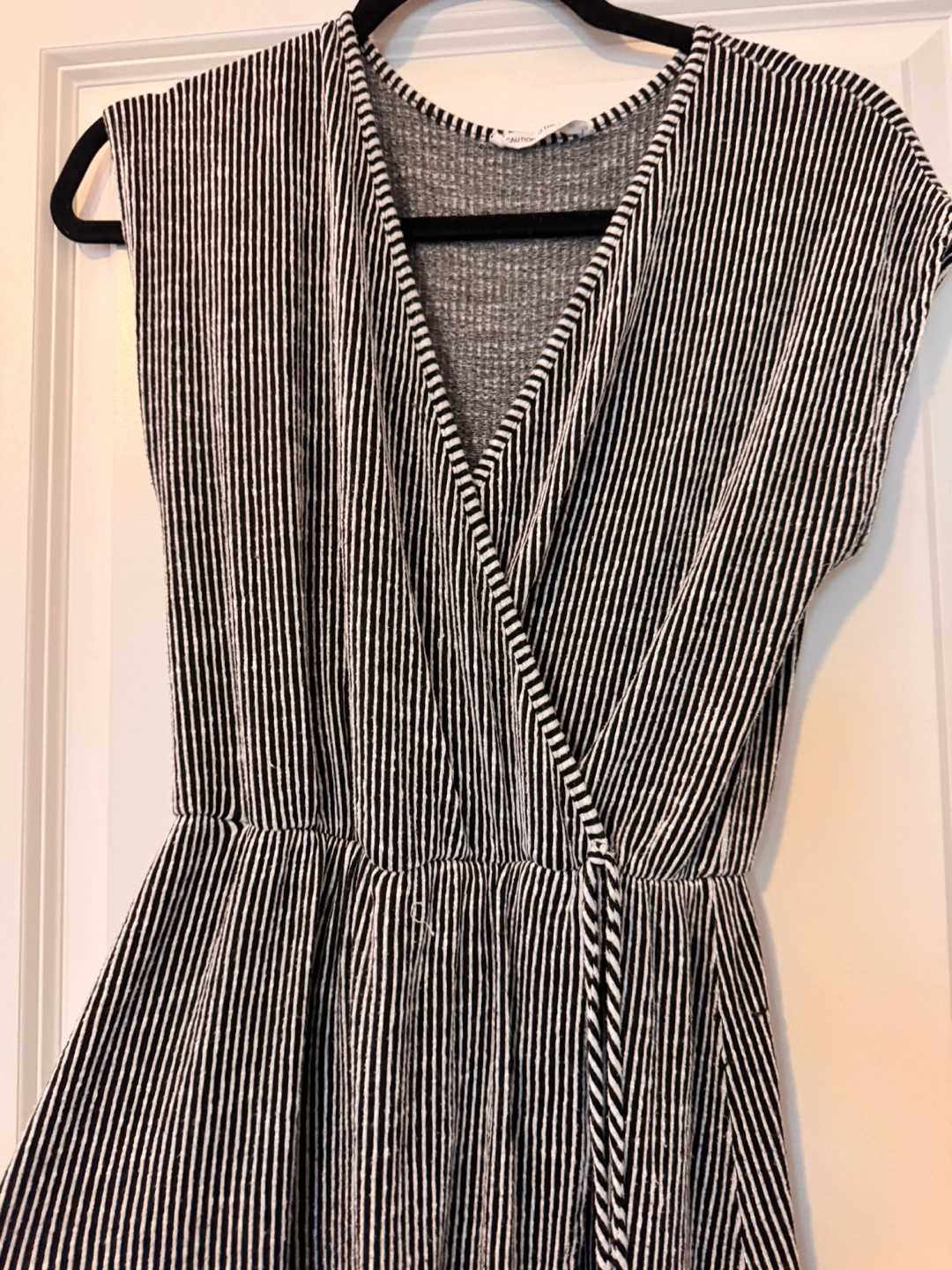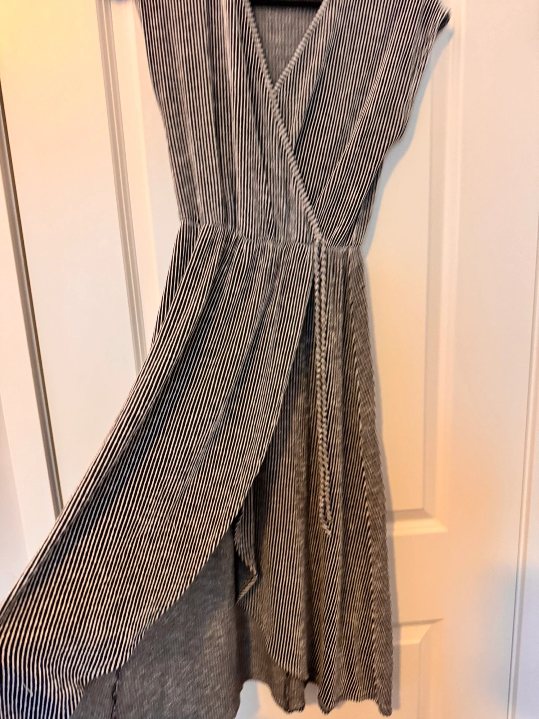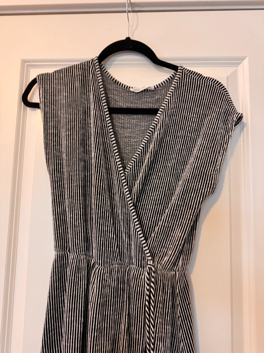 Black and white striped wrap dress. High-low hemline. Short sleeves. Lightweight material. Great for summer.