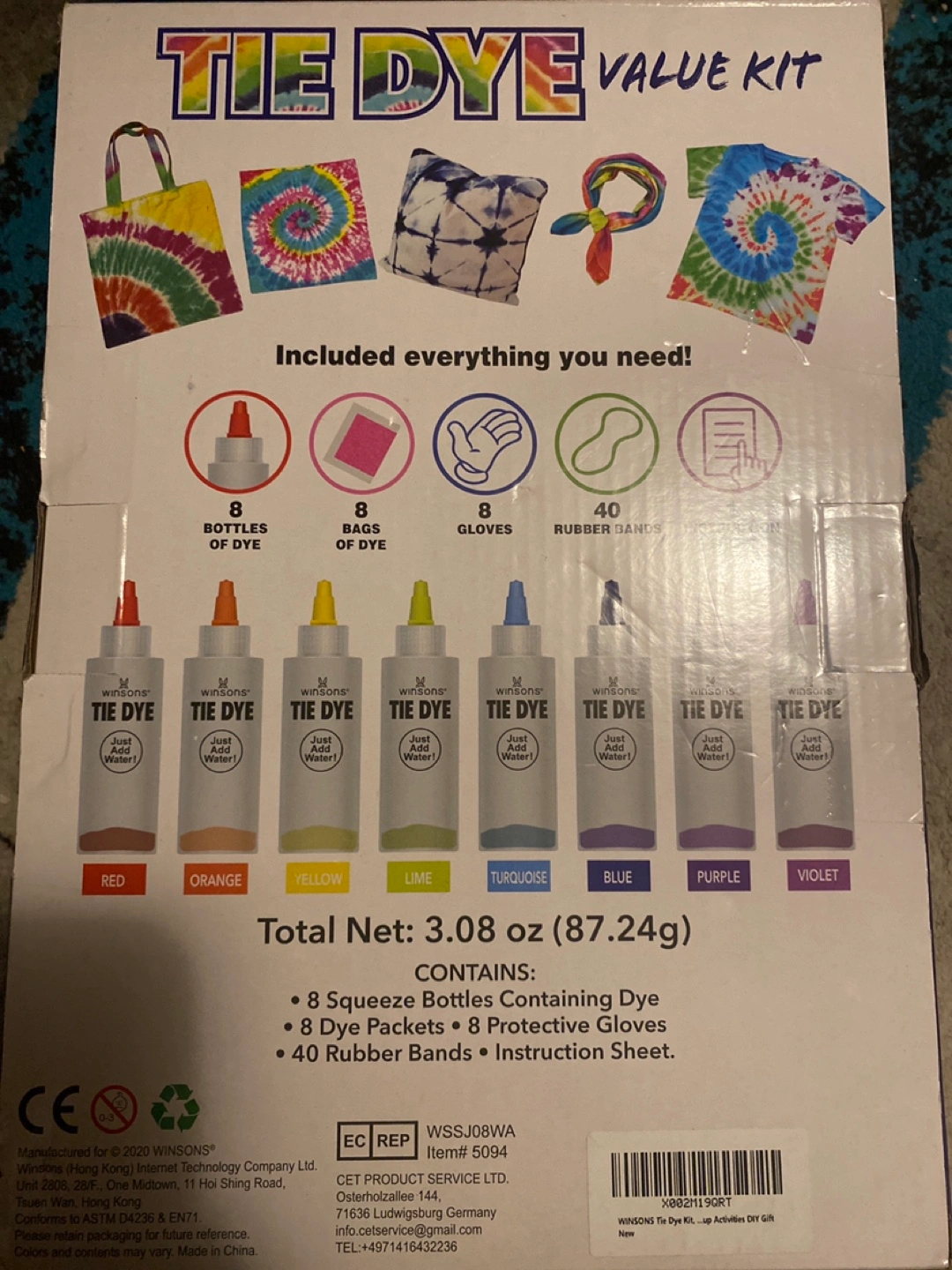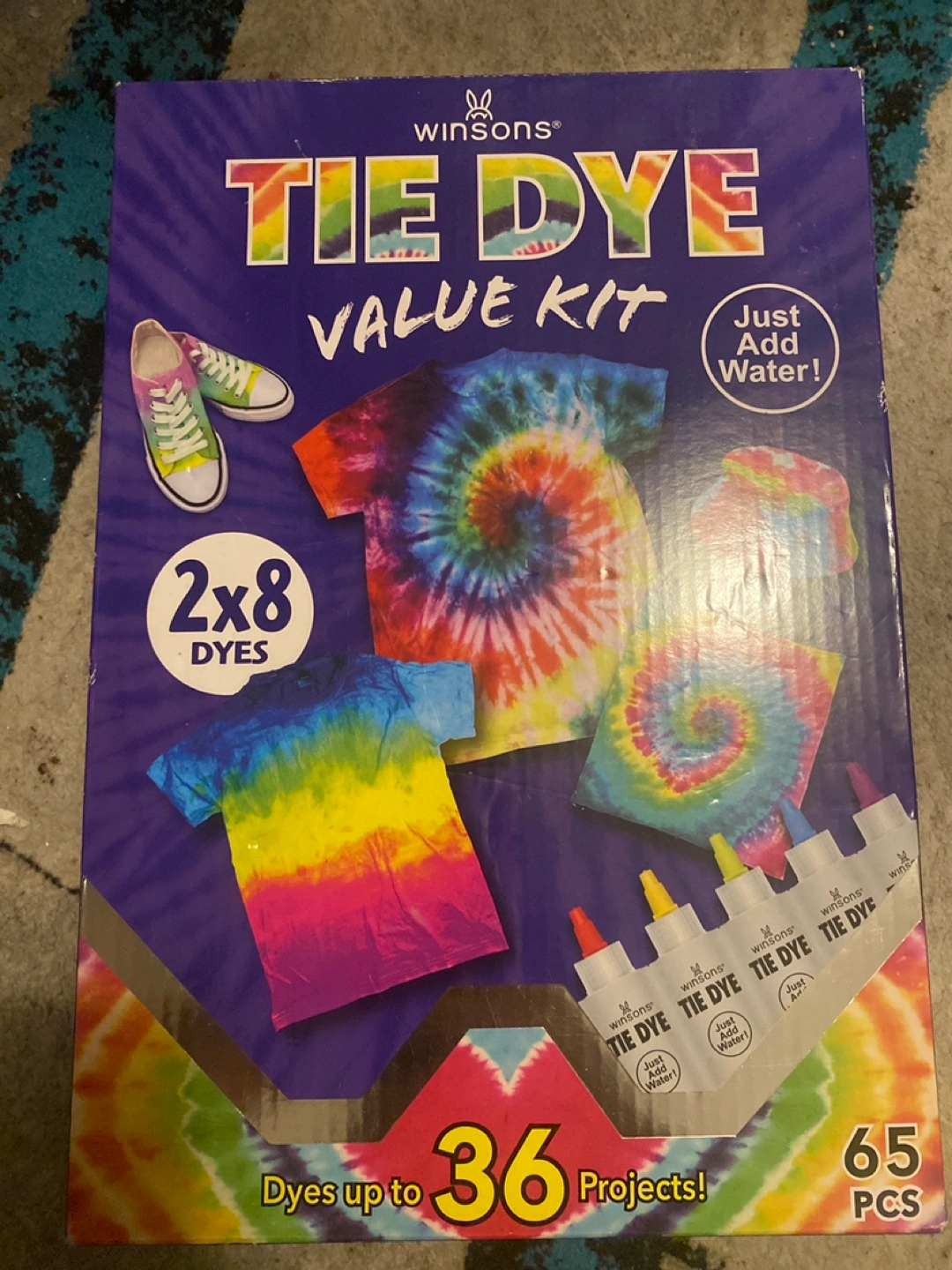 881Tie dye kit. Includes eight bottles of dye, eight bags, eight gloves, forty rubber bands, and instructions. Dyes up to 36 projects. Just add water!