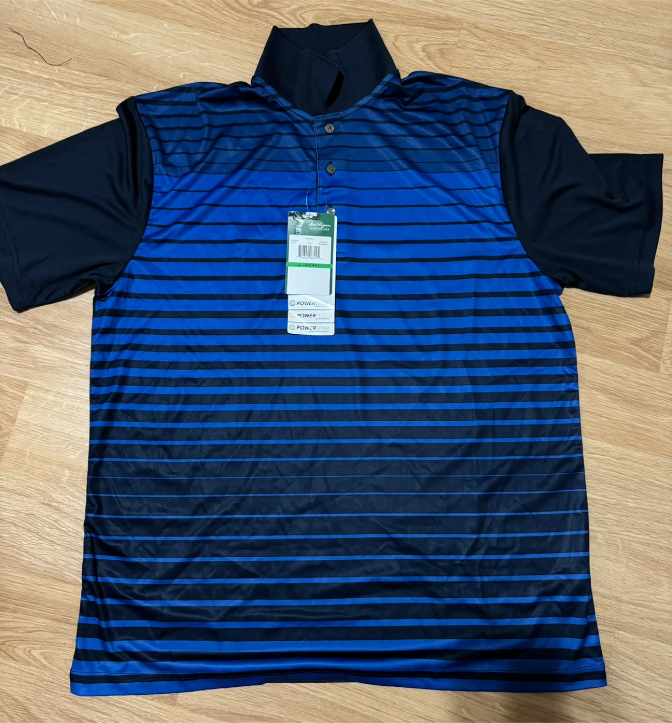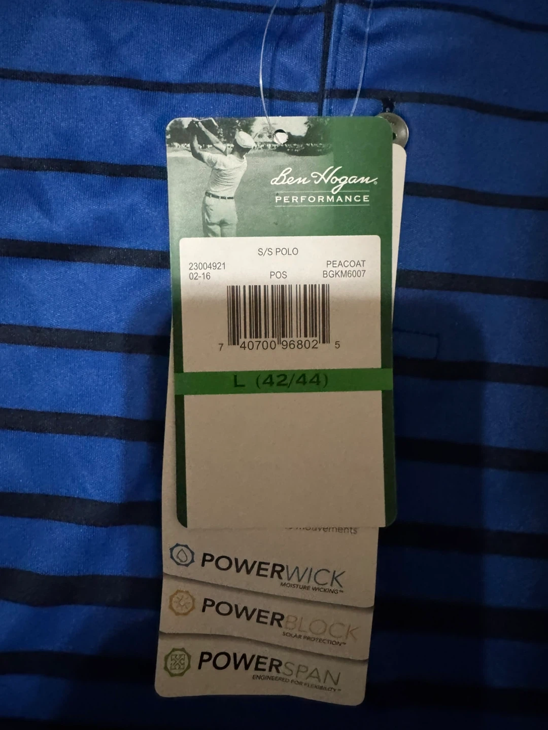 Selling a Ben Hogan Performance polo shirt in size L (42/44). It's a stylish blue and black striped design. The shirt features PowerWick for moisture wicking, PowerBlock for solar protection, and PowerSpan for flexibility