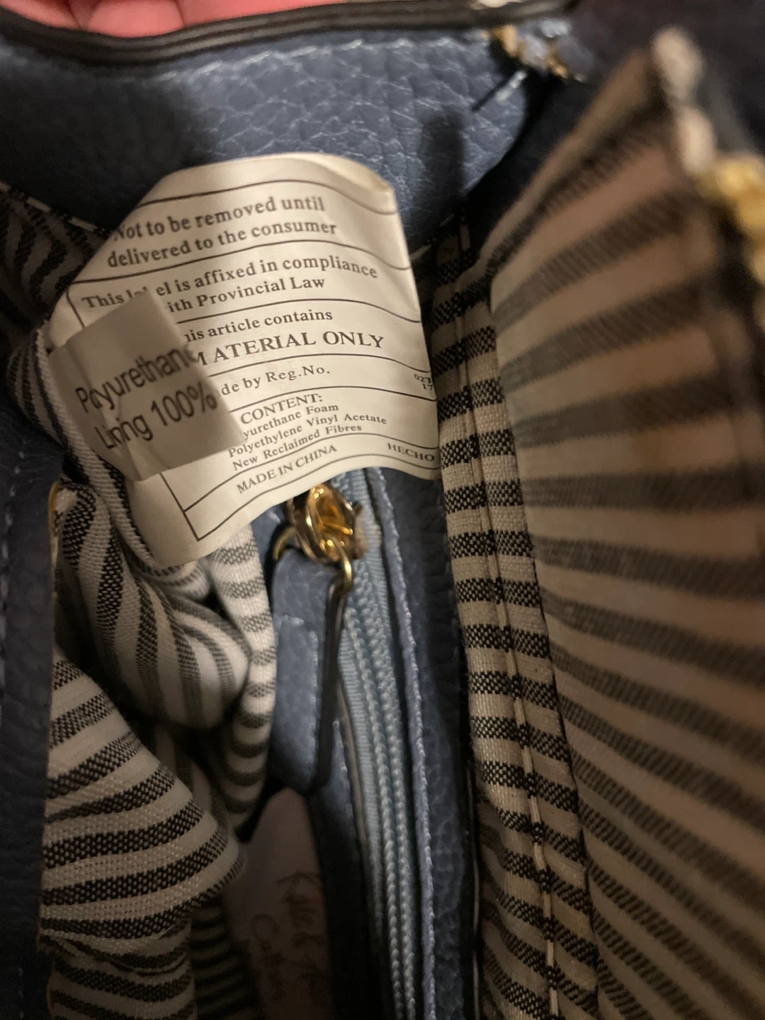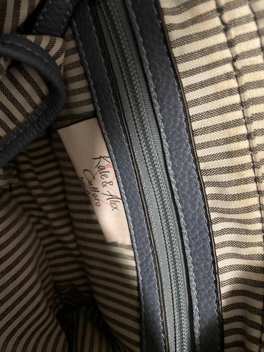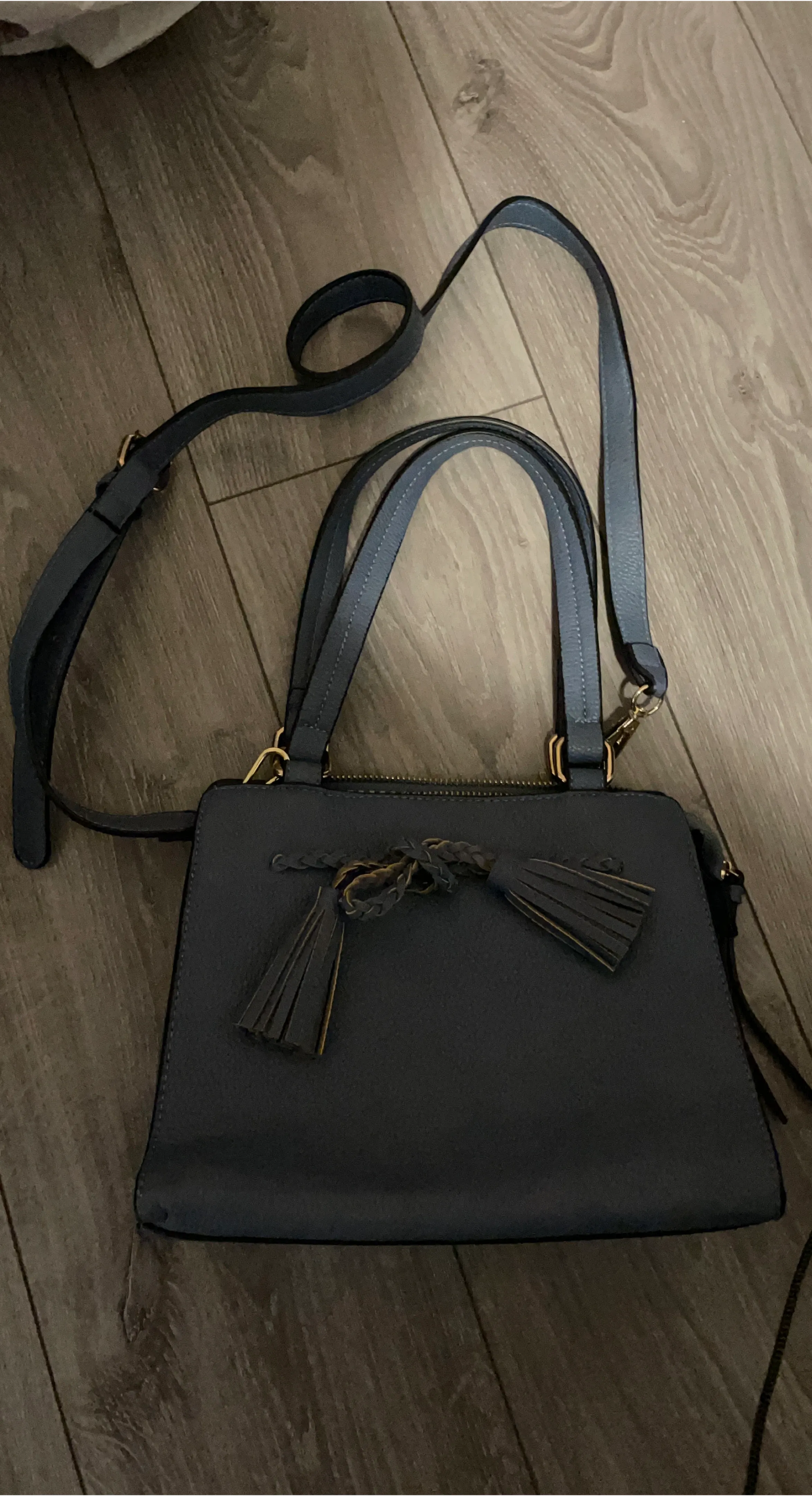 This is a Kate & Alex purse with an adjustable crossbody strap. It's made of polyurethane material with a 100% lining. It features a braided detail on the back and tassels on the front.