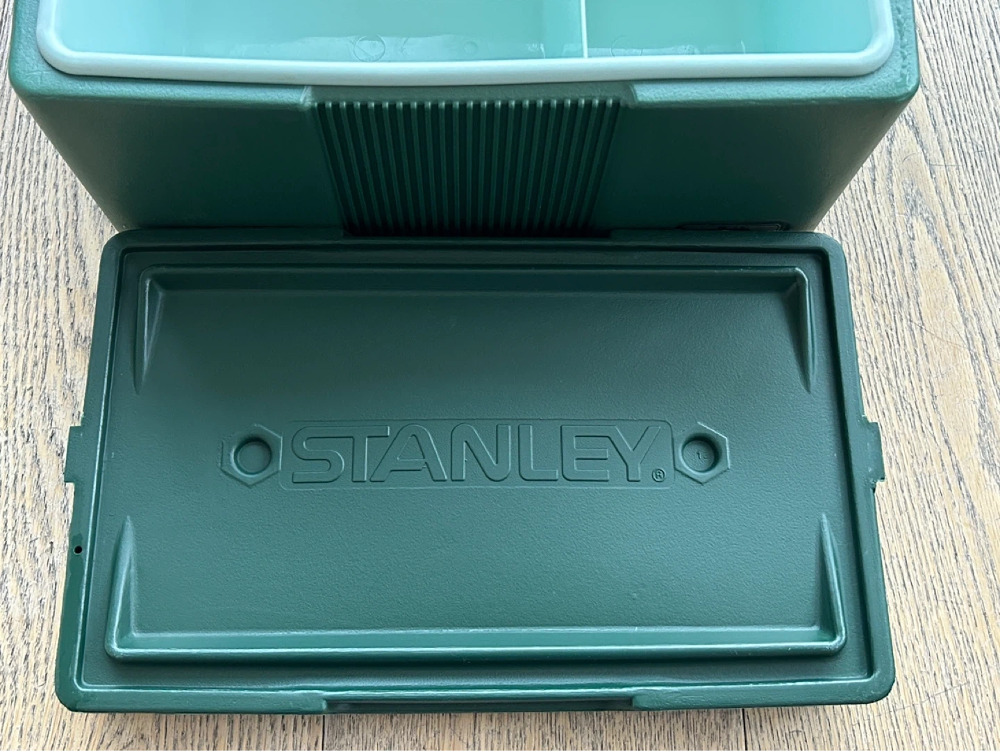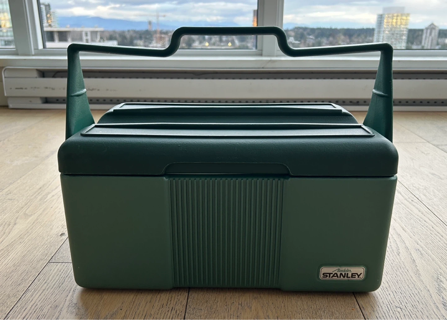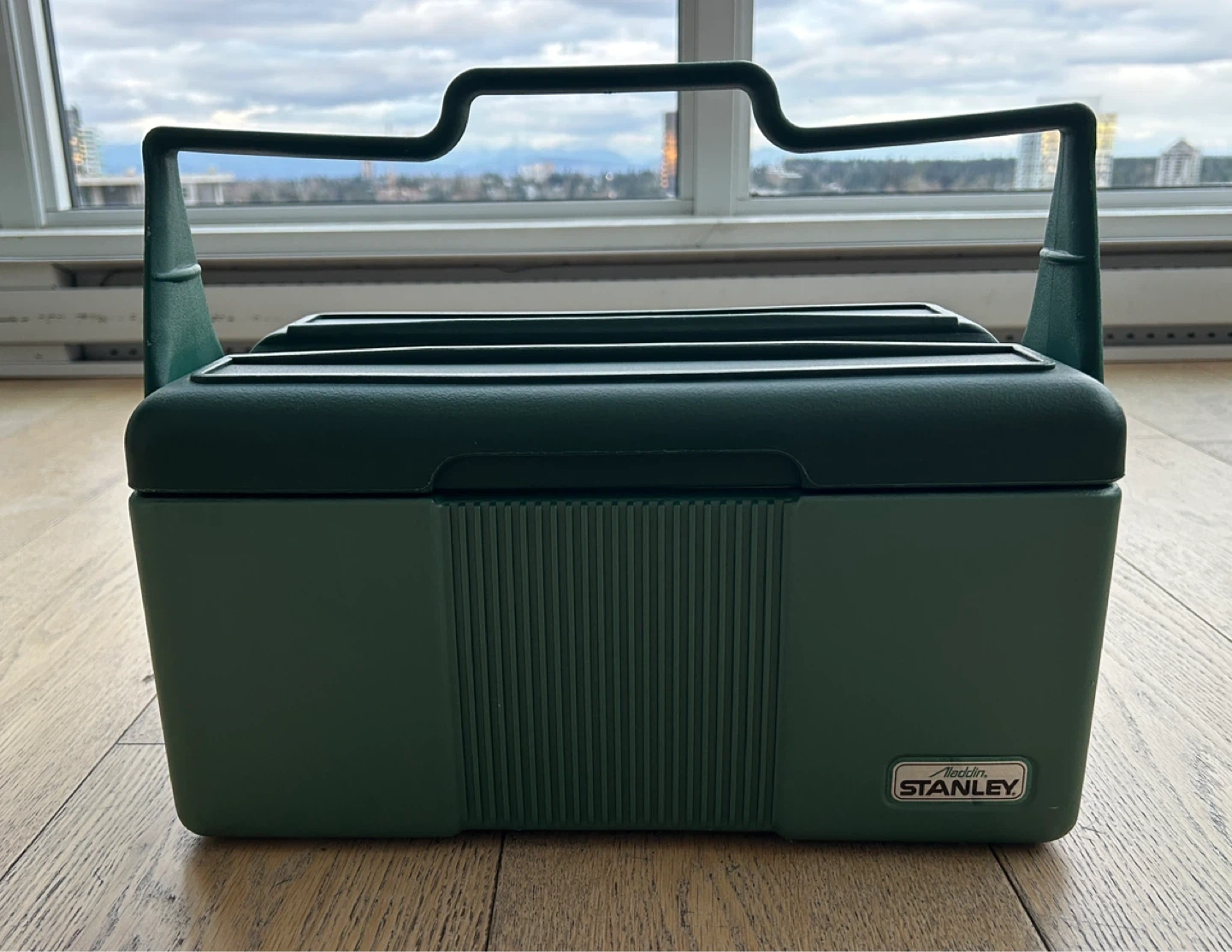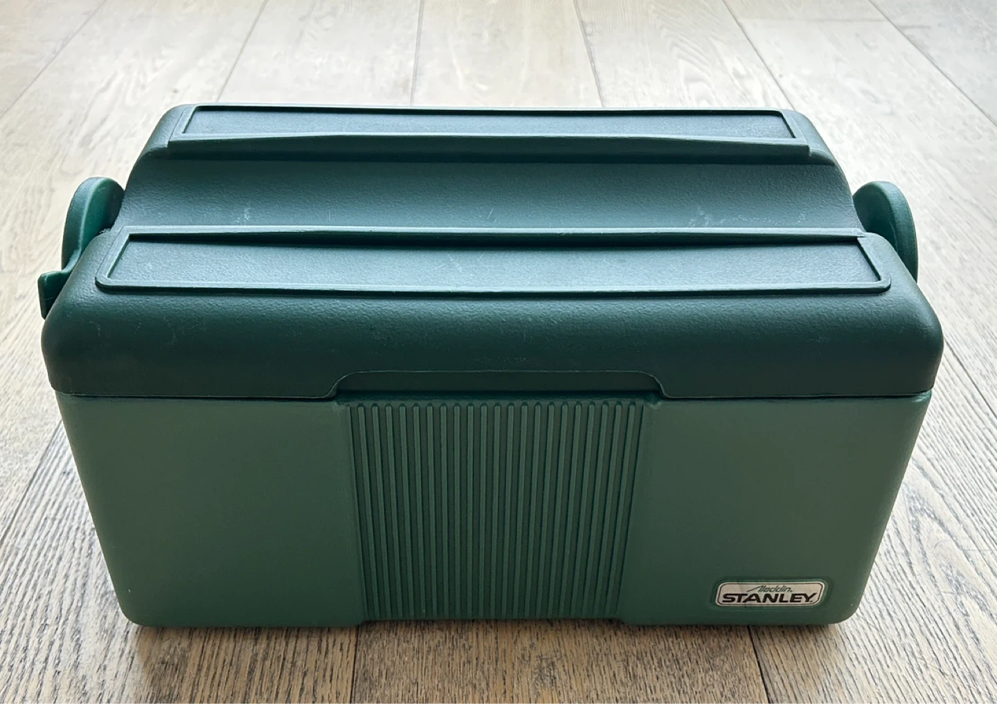 Vintage Green Stanley cooler box. Made by Aladdin Industries in the USA. It has a sturdy handle and lid. Beautiful green colour. Very good condition.
