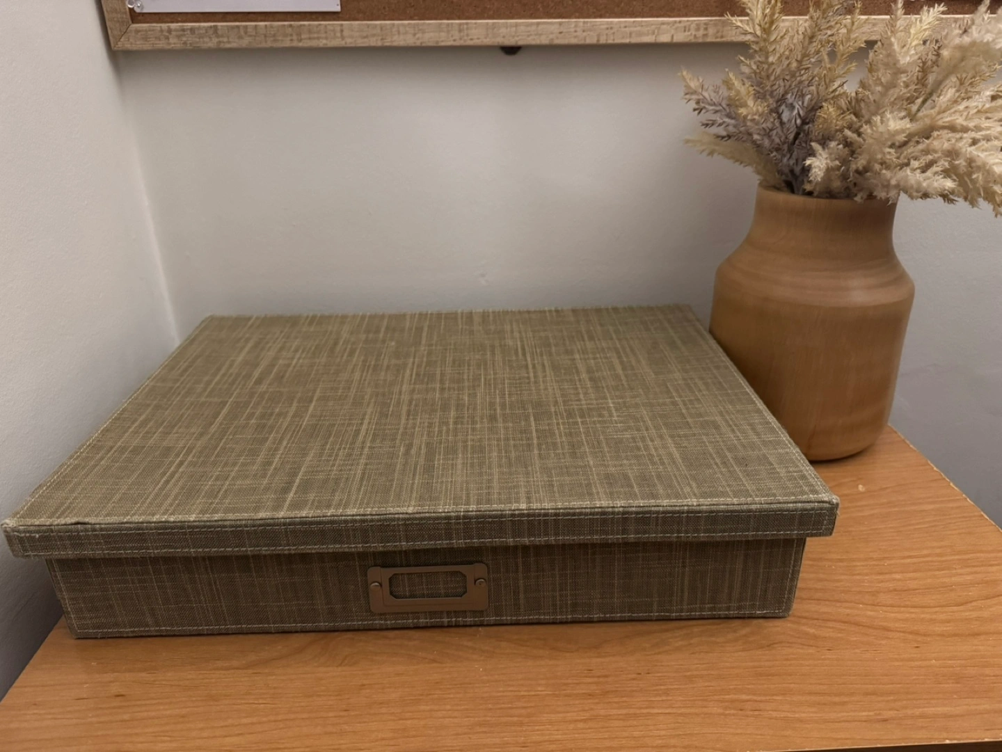 Spacious storage box, beige fabric exterior. Features a label holder. Perfect for organizing and storing items.