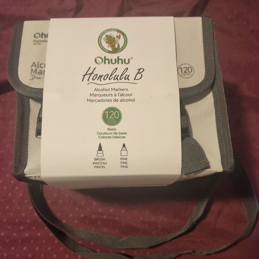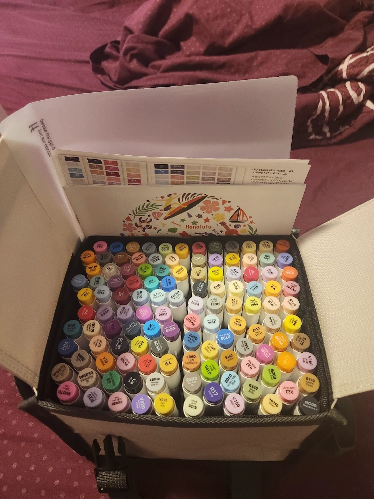 120 alcohol markers in a carrying case. Includes colour chart and brush/fine tips. Basic colours.