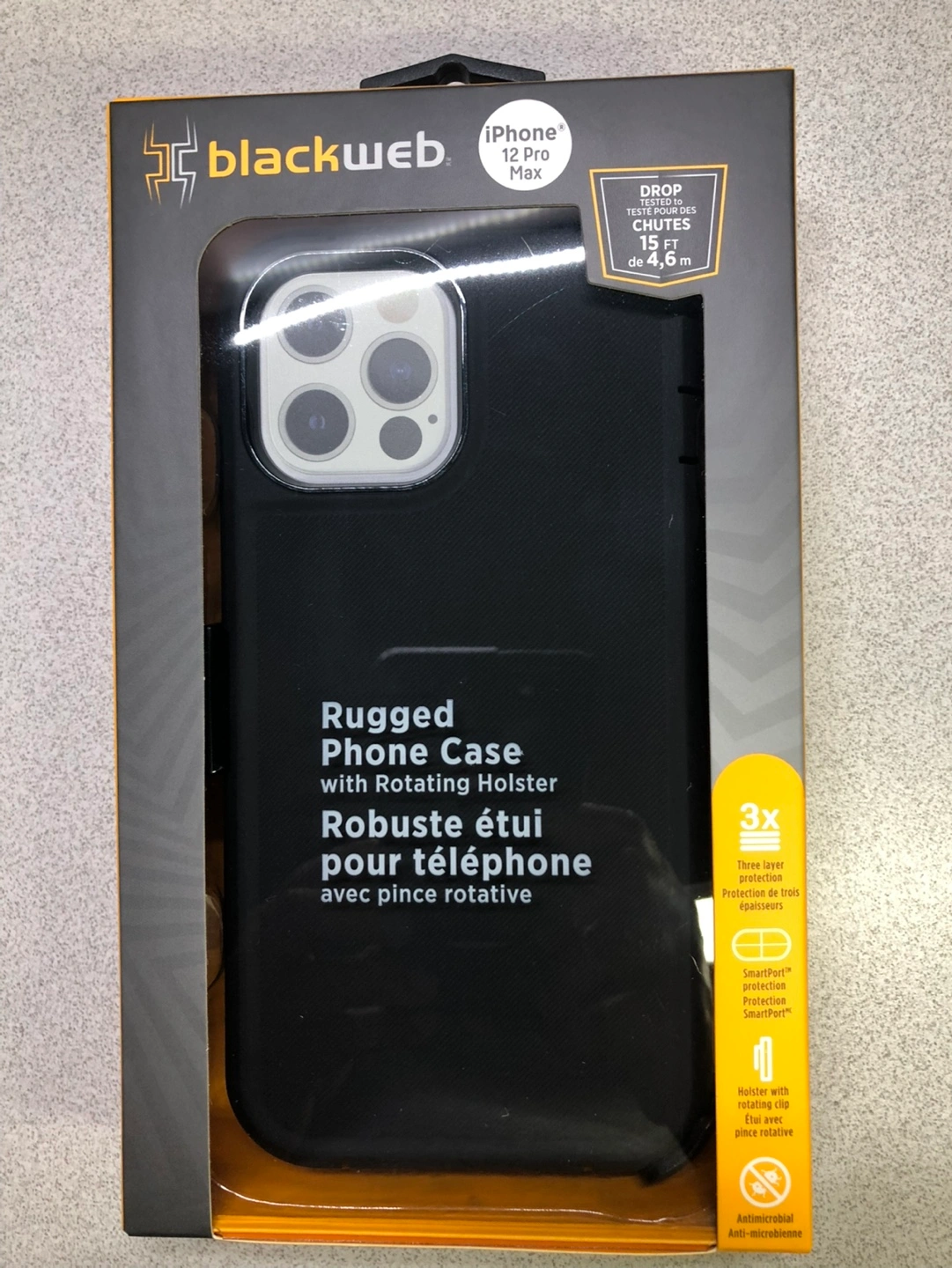 23Black rugged phone case. Rotating holster. Three-layer protection. Drop protection up to 15 feet. Anti-microbial. For iPhone 12 Pro Max.
