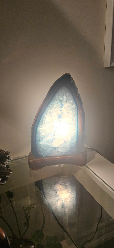 Beautiful agate crystal lamp. Unique piece. Wooden base. Adds ambient light. Plug-in.