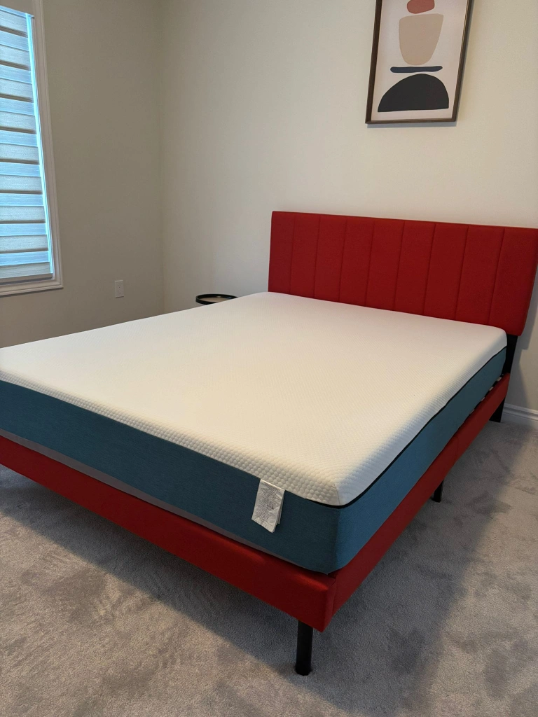 Queen size mattress and platform bed frame. Red upholstered headboard. Teal and white mattress. Minimal assembly required.