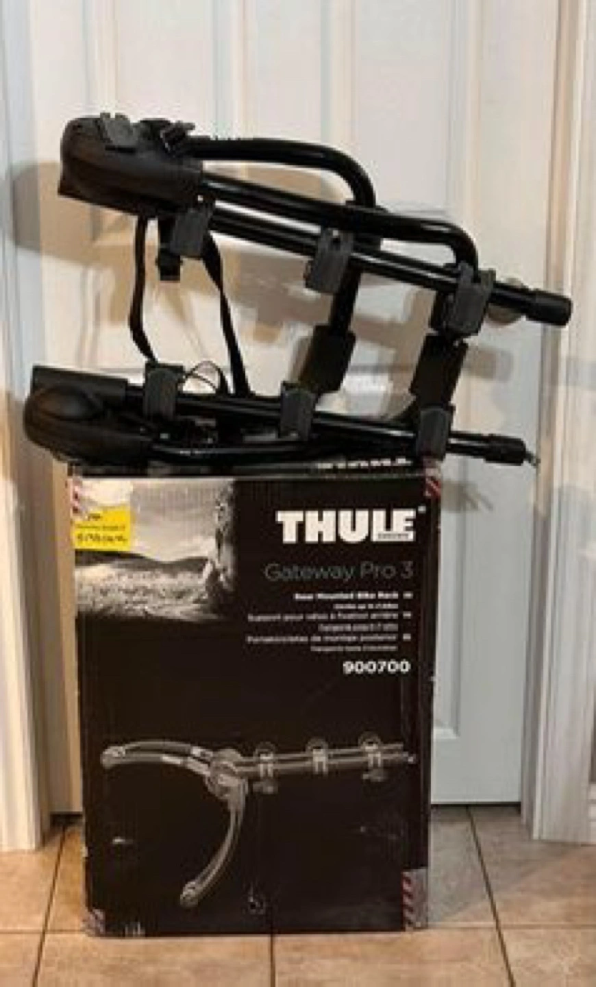 New Thule Gateway Pro 3 hitch-mount bike rack. Holds three bikes. Anti-sway cradles. Seven-inch spacing between bikes. Excellent condition; never used.